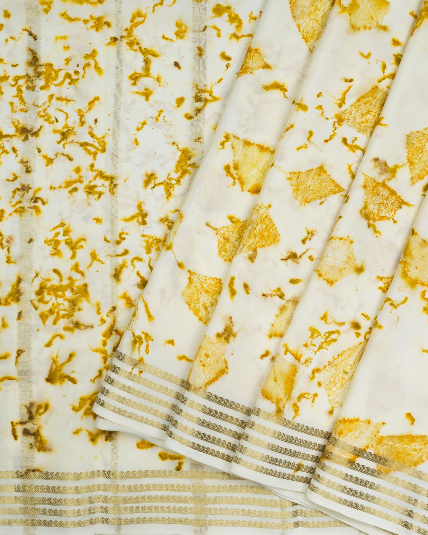 Cream Mysore silk saree features golden yellow leaf-inspired eco prints and a subtle mango-striped zari border.