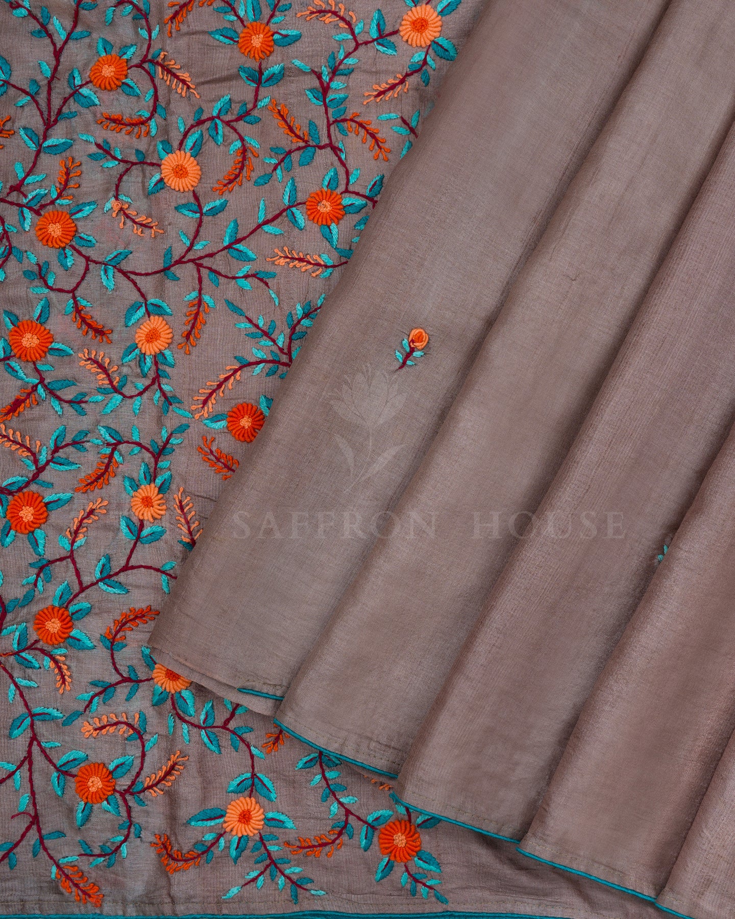 Elegant in its simplicity and rich in craftsmanship, this dark grey Tussar silk saree is a true celebration of handwork. The body is delicately adorned with small rose motifs, intricately done in fine hand thread work, lending a subtle charm to its matte silk texture. With no heavy border, the saree features a minimal piping edge that keeps the look contemporary and refined. The pallu showcases exquisite all-over hand embroidery and threadwork brocade, adding depth and artisanal beauty. Paired with a plain dark grey blouse enhanced by a hand-worked border, this saree is perfect for sophisticated gatherings, artful occasions, or elegant evenings where detail makes the statement.
