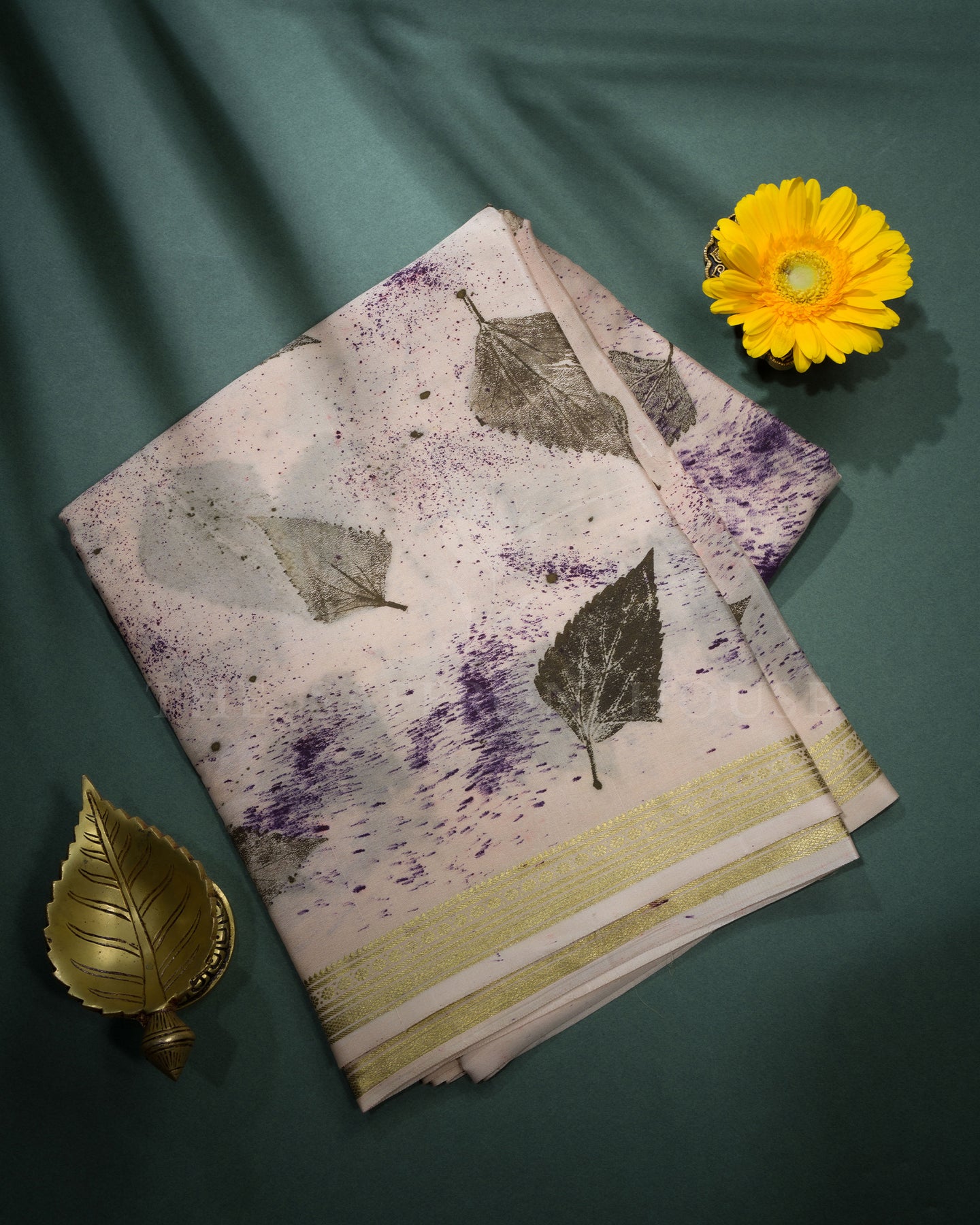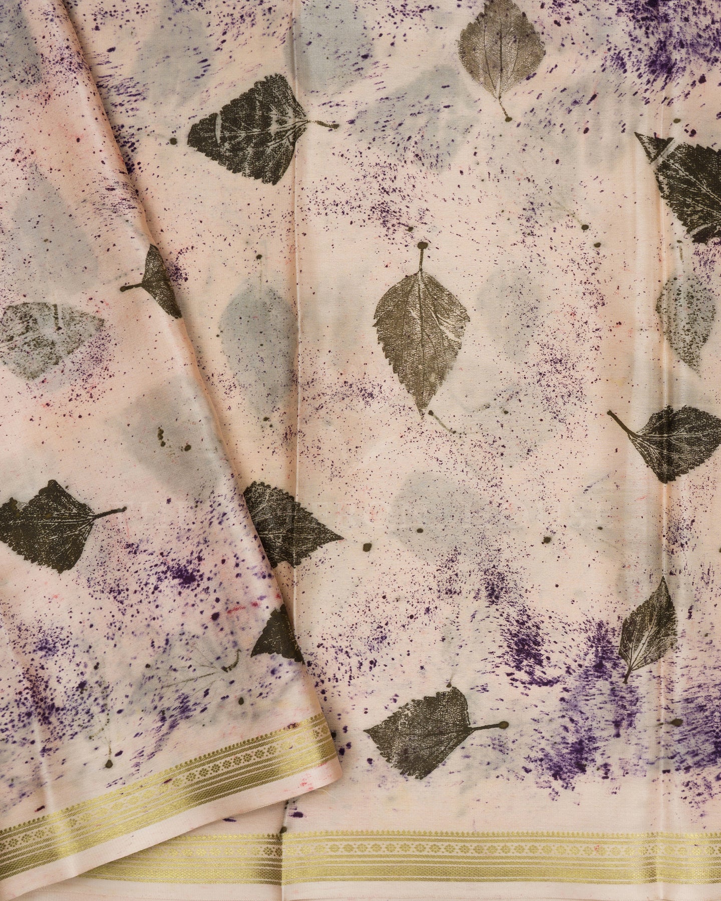 Light peach Mysore silk saree features delicate leaf eco prints with subtle purple accents and a graceful zari border