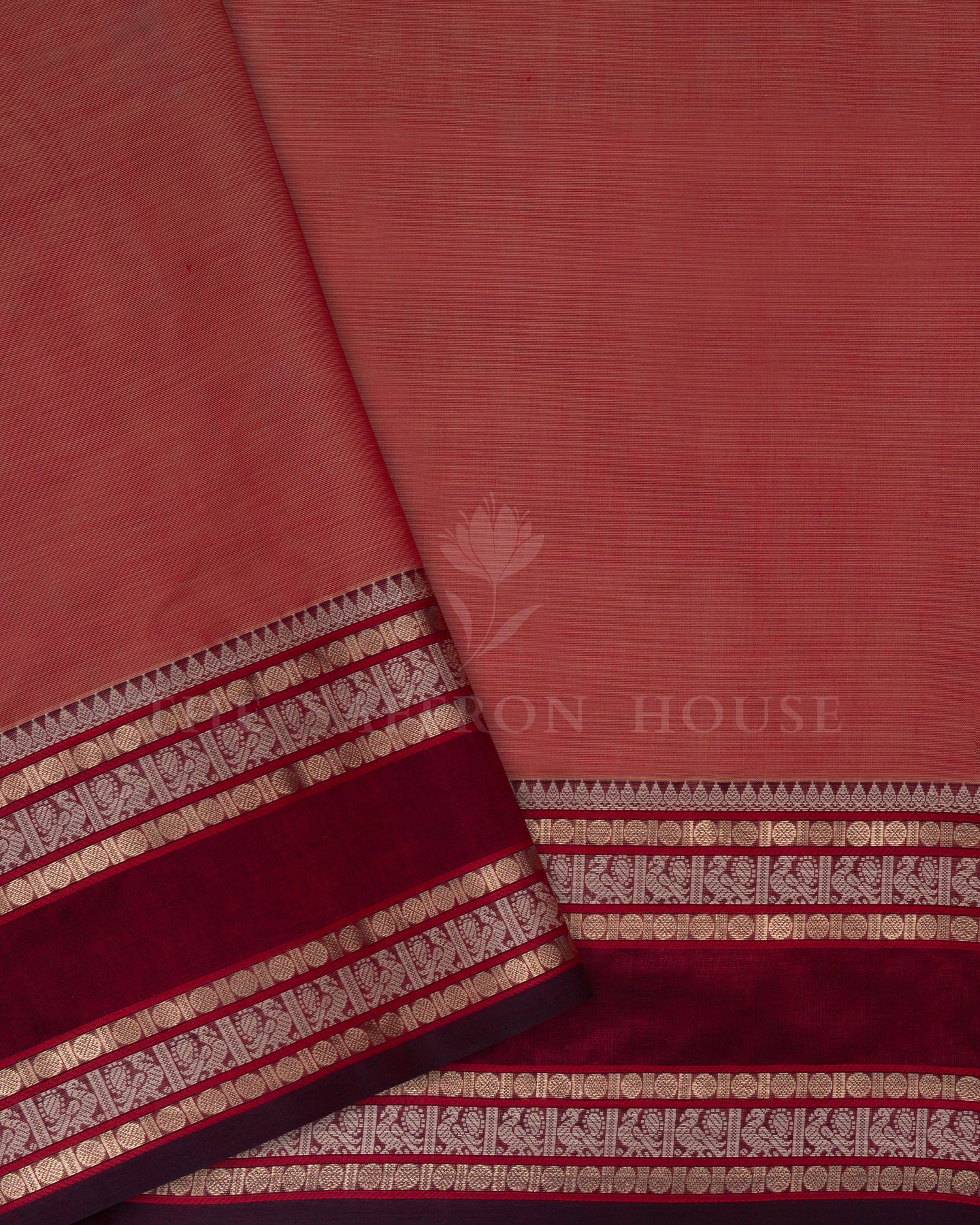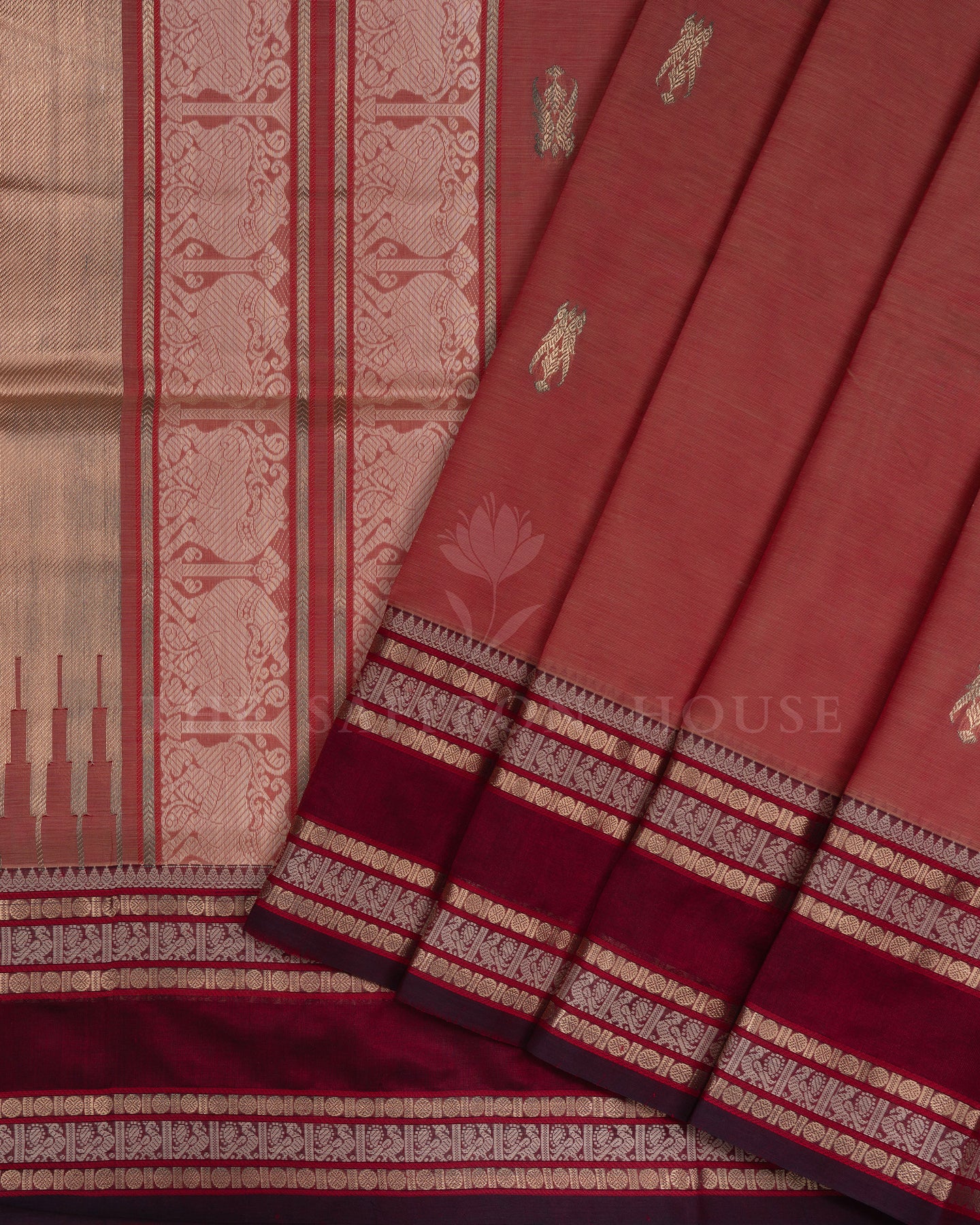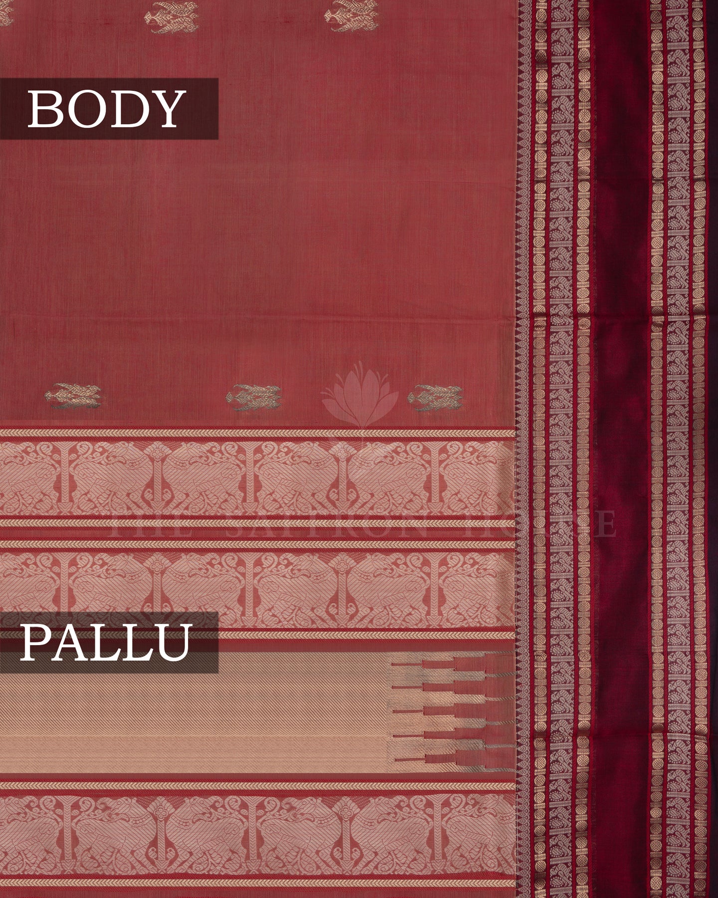 Light rust orange cotton silk saree with maroon Mayil Chakram border and yali-motif pallu