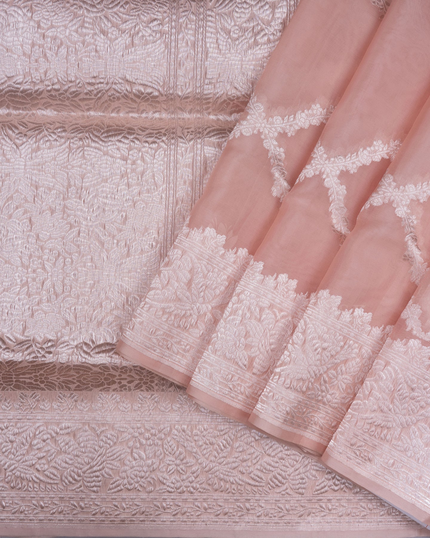 Soft, graceful, and undeniably elegant, this pastel powder pink Banarasi organza saree features a stunning silver zari diamond jal design that adds a touch of grandeur to its airy, translucent body. The silver floral brocade border enhances the delicate charm of the saree with intricate craftsmanship, perfectly mirrored in the richly woven floral brocade pallu. Paired with a pastel powder pink blouse adorned with subtle stripes and a matching border, this saree is an ideal choice for weddings, receptions, and elegant daytime occasions where refined beauty takes center stage.