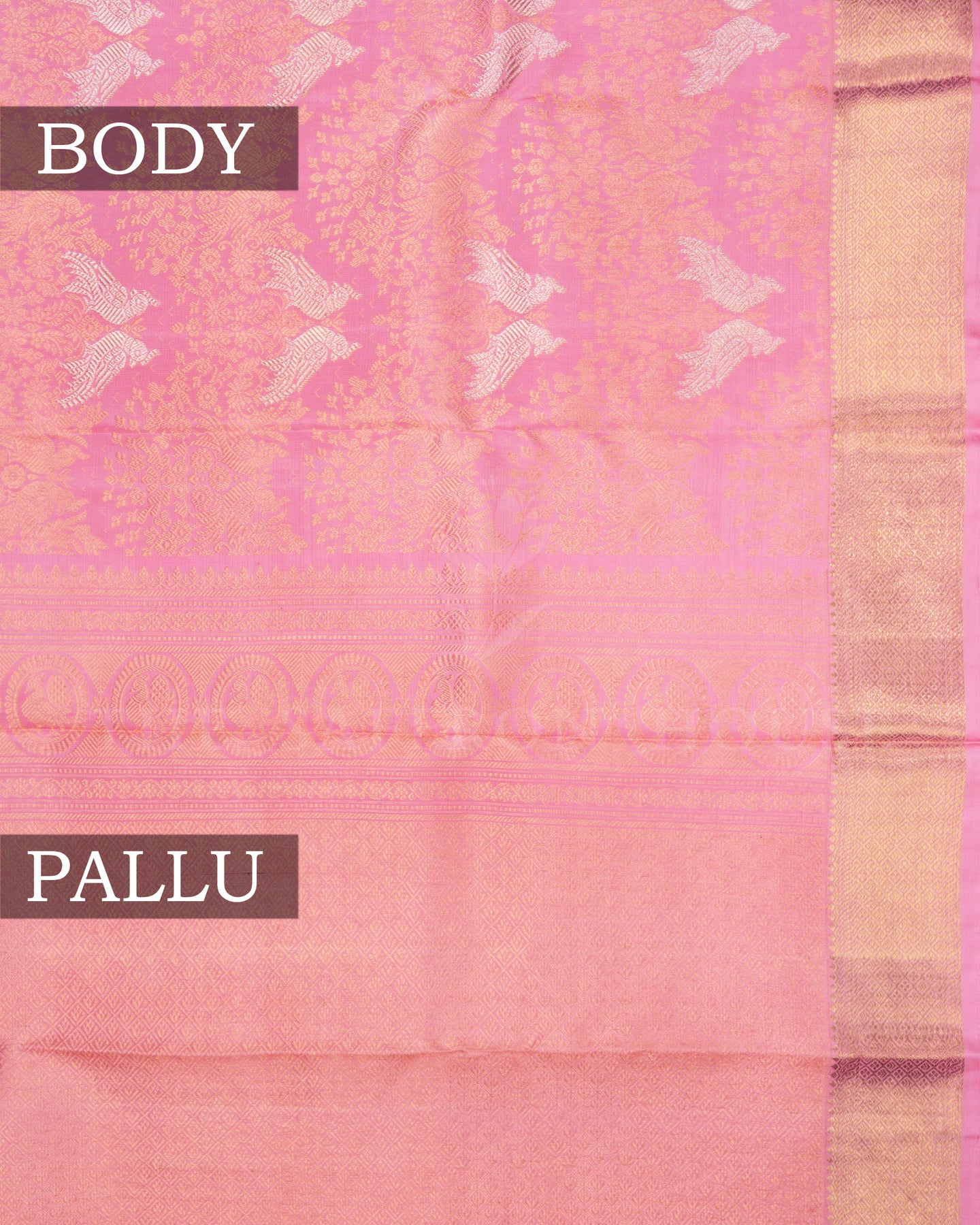 A baby pink Kanjivaram silk saree with silver and gold zari bird and jal motifs, finished with a subtle gold border and a rich brocade pallu
