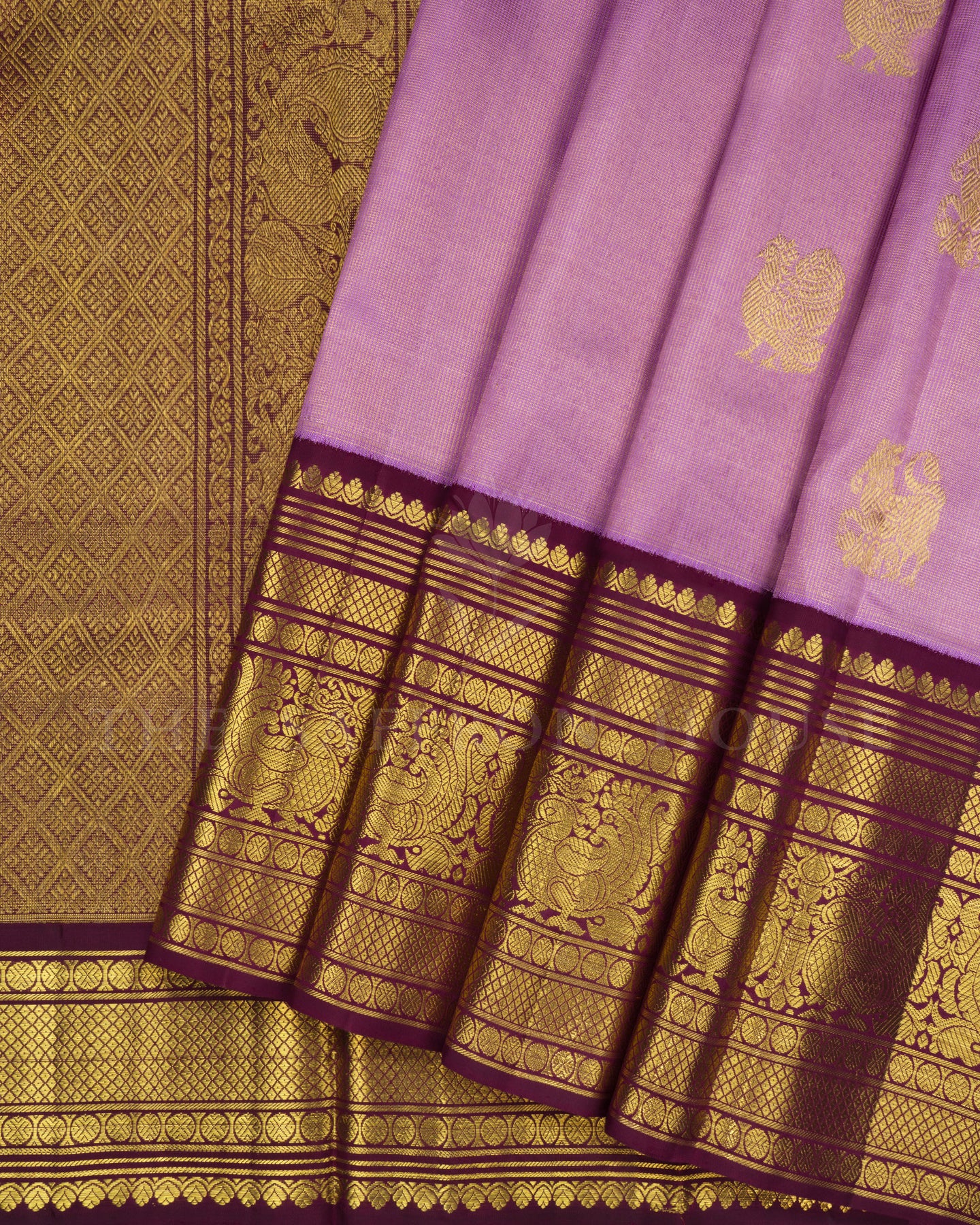 Experience timeless elegance with this stunning Lilac Kanjivaram Silk Saree, where tradition meets artistry in perfect harmony. The gentle lilac body is intricately woven with delicate small checks, beautifully interlaced with exquisite peacock and yali motifs — symbols of grace and power that bring a regal touch to the fabric. Framed by a rich chocolate brown korvai border, this saree exudes sophistication with its classic traditional craftsmanship. The luxurious chocolate brown pallu dazzles with intricate zari brocade work, making it a breathtaking masterpiece for grand occasions. Complemented by a matching chocolate brown blouse adorned with a refined vaira oosi design and border, this saree is a celebration of heritage and elegance — perfect for those who wish to make a lasting impression.