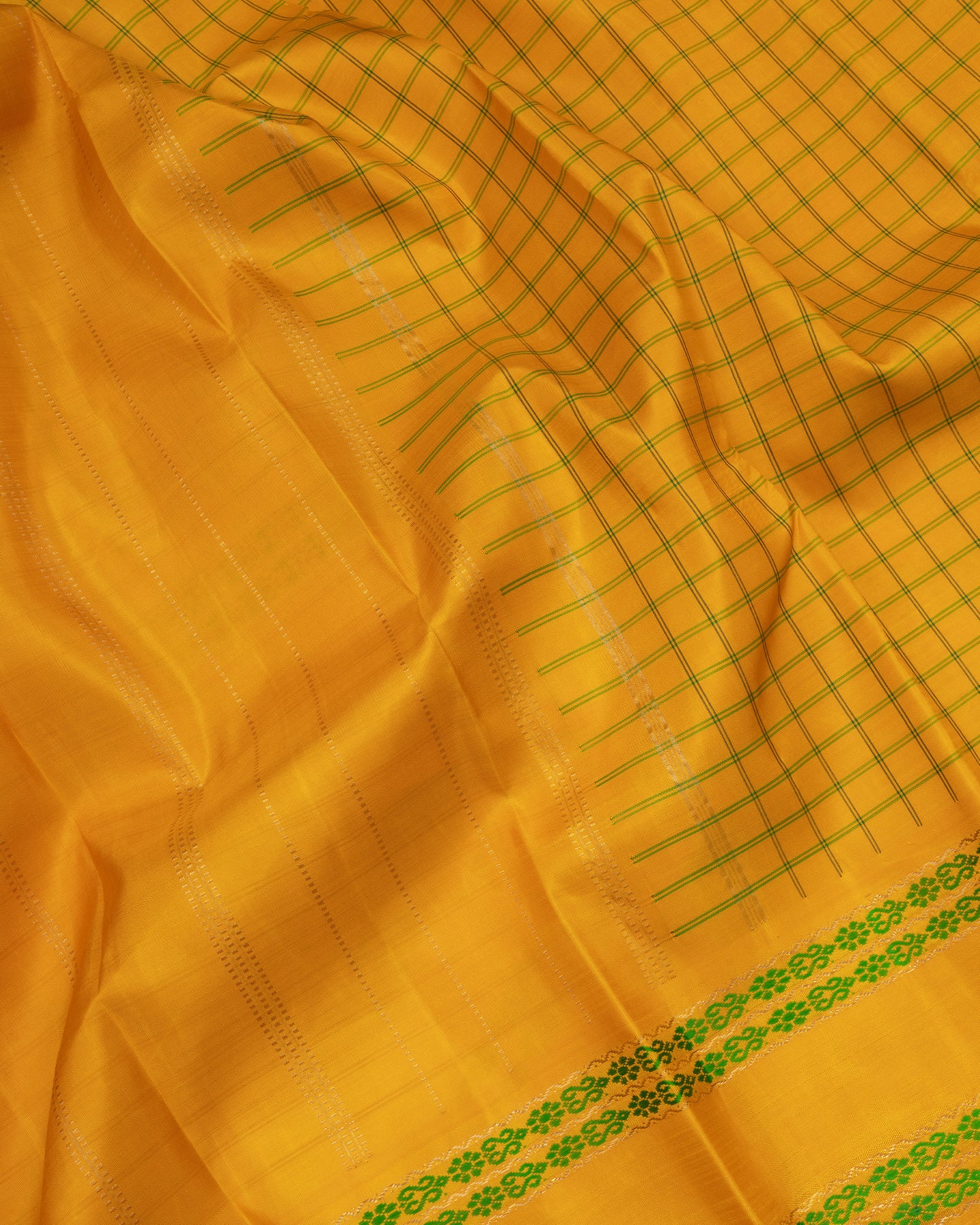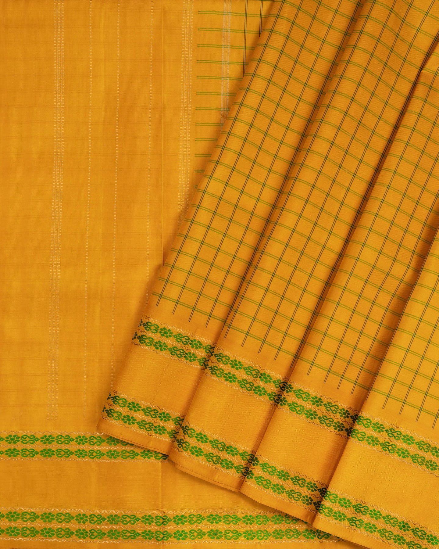 Radiate warmth and tradition with this mustard yellow Kanjivaram silk saree, featuring a charming checks pattern in leaf green that adds subtle texture and vibrancy to the body. The matching self-colored border is delicately detailed with small leaf green retta pet motifs, maintaining a harmonious and refined look. The simple traditional pallu complements the saree’s understated elegance, creating a perfect balance of classic style and minimal sophistication. Paired with a matching mustard yellow blouse adorned with a small retta pet border, this saree is ideal for festive gatherings, casual celebrations, or elegant daytime events.