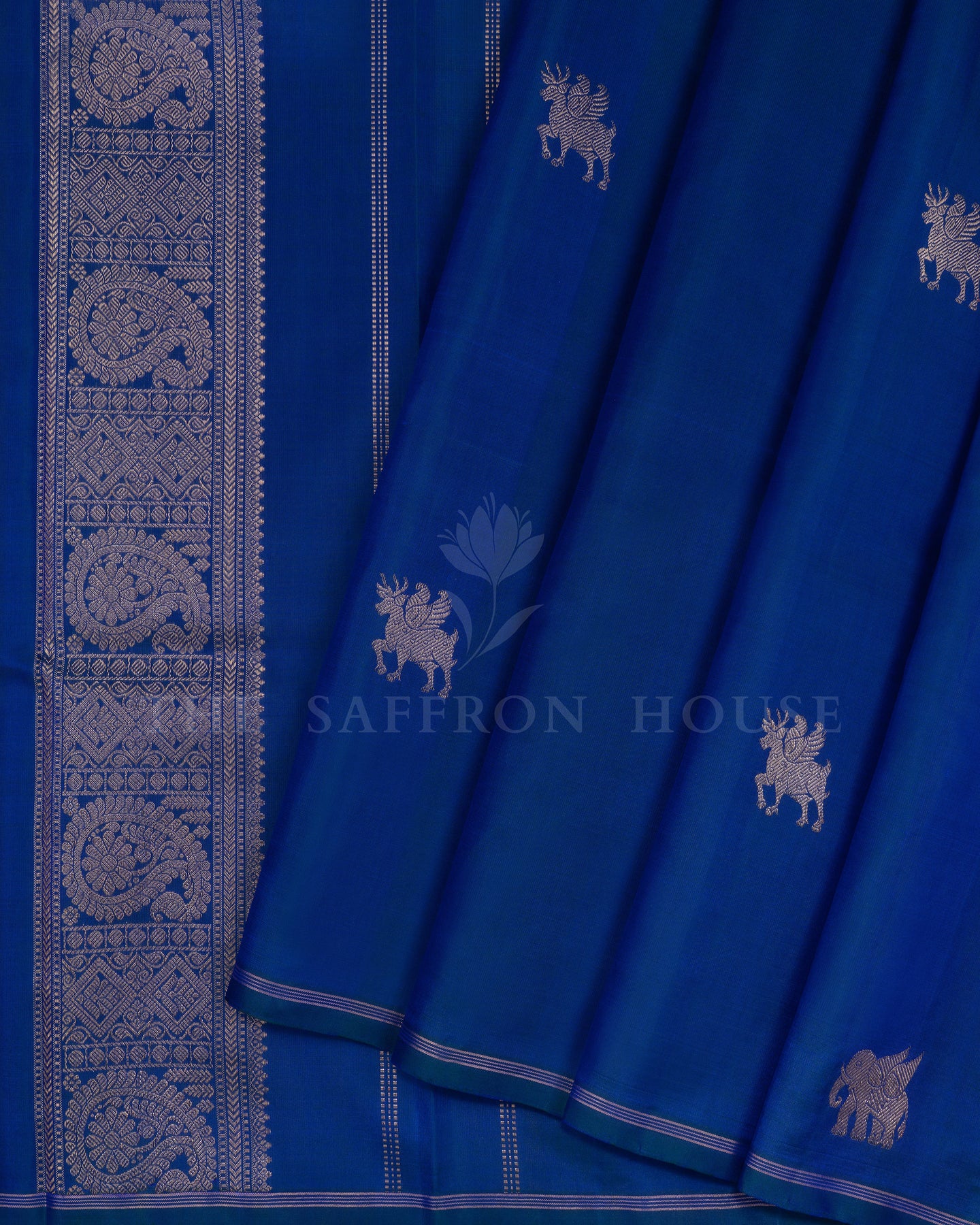 Make a subtle yet striking statement with this exquisite Peacock Blue Kanjivaram silk saree, beautifully adorned with intricate elephant and deer motifs that celebrate nature and tradition. The saree’s No Border Design enhances the beauty of its rich body, allowing the detailed motifs to shine. The matching self-colored pallu features a simple and traditional design, adding understated elegance to the ensemble. Paired with a plain mustard yellow blouse, this saree is perfect for those who appreciate classic charm with a minimalist touch, ideal for festive occasions and graceful gatherings.