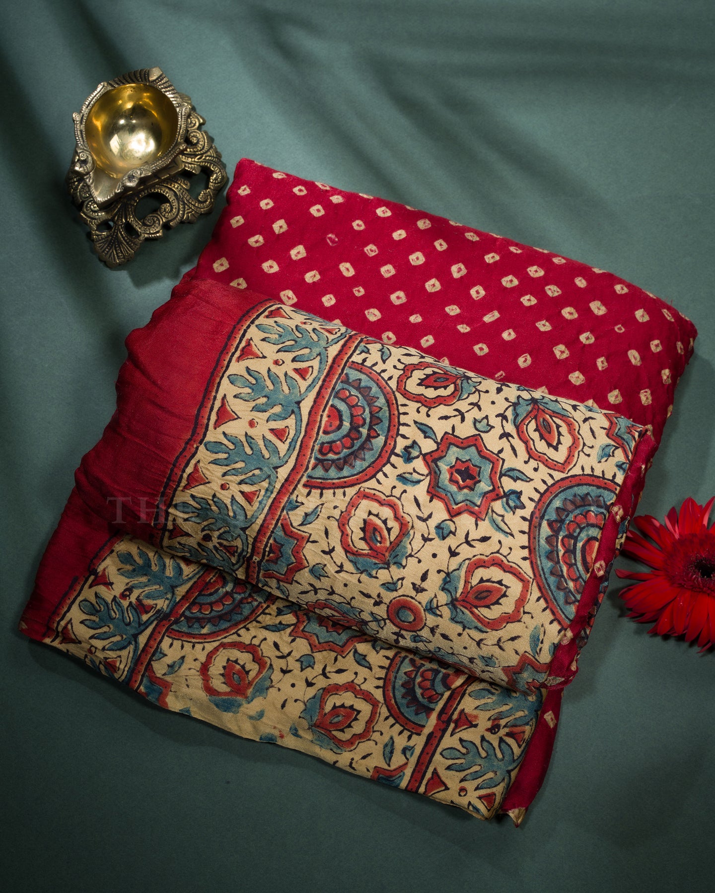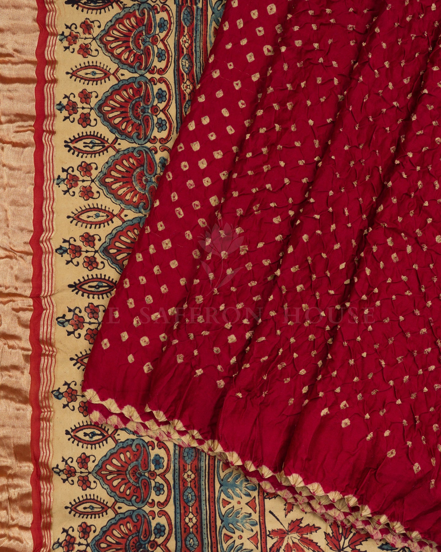 This saree hails from the craft clusters of Kutch and Rajasthan, where age-old traditions of Ajrakh printing and Bandini tie-dyeing thrive. Artisans from these regions practice meticulous, multi-step processes passed down through generations — Ajrakh printing is done with natural dyes on hand-carved wooden blocks, while Bandini involves precision tie-dyeing that creates intricate dotted patterns.