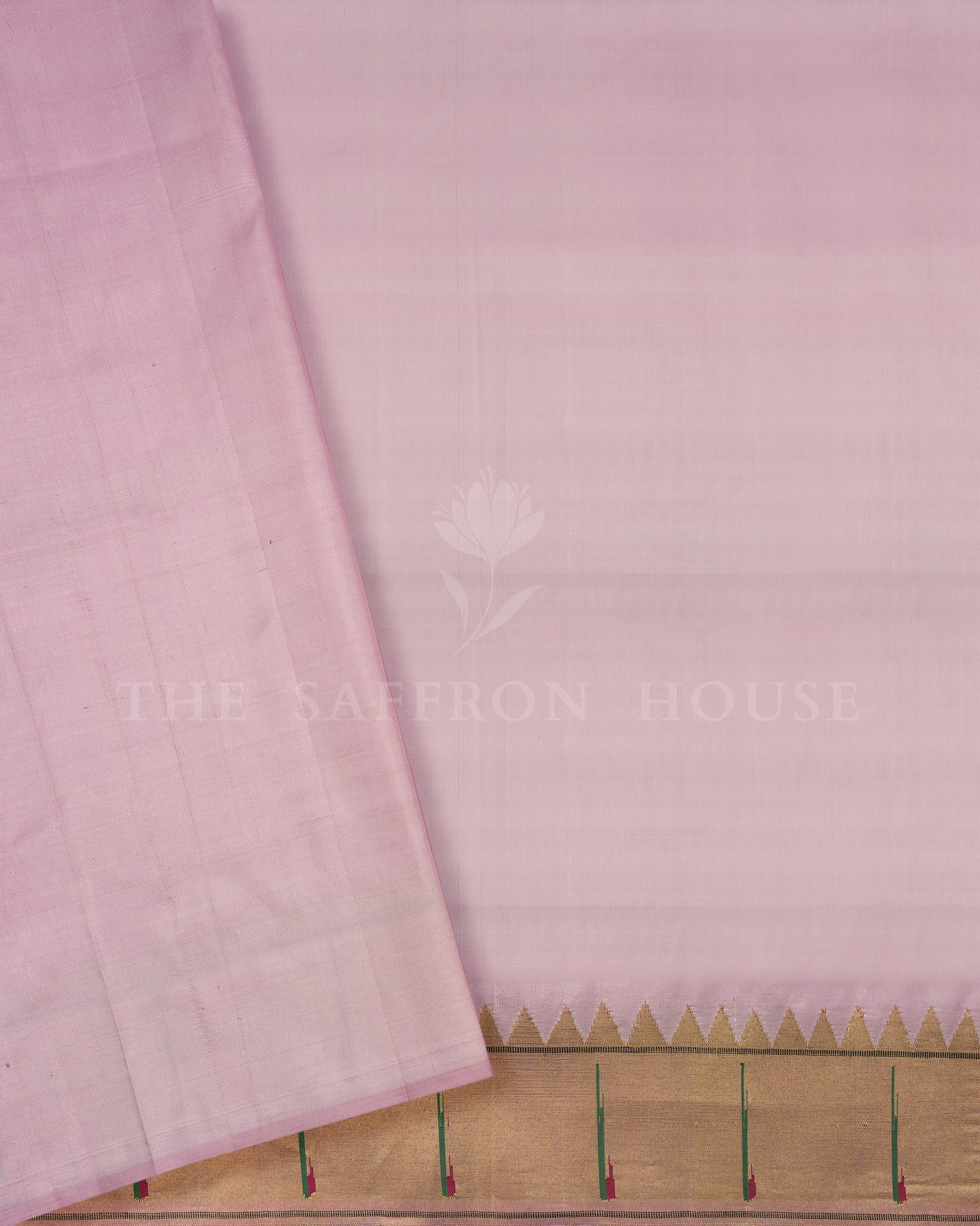 The matching temple border, enriched with gold brocade and classic Minakari Paithani malli moggu buttas, adds regal charm, while the matching pallu, featuring exquisite Meenakari floral brocade, completes the luxurious drape.