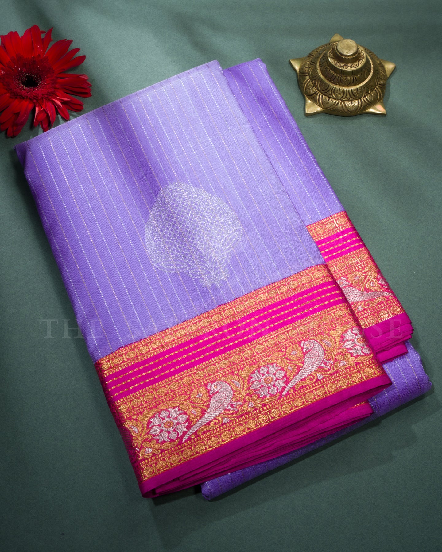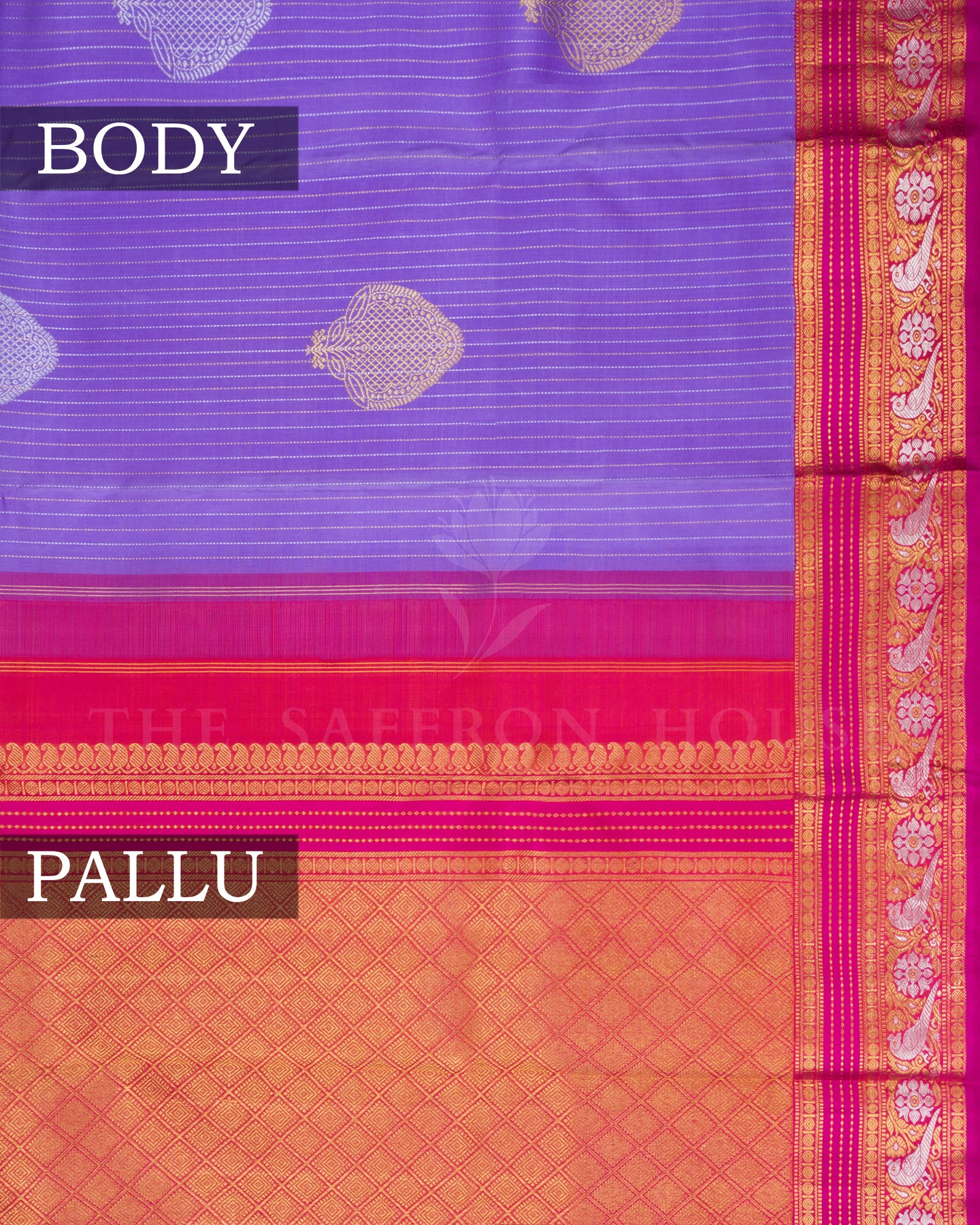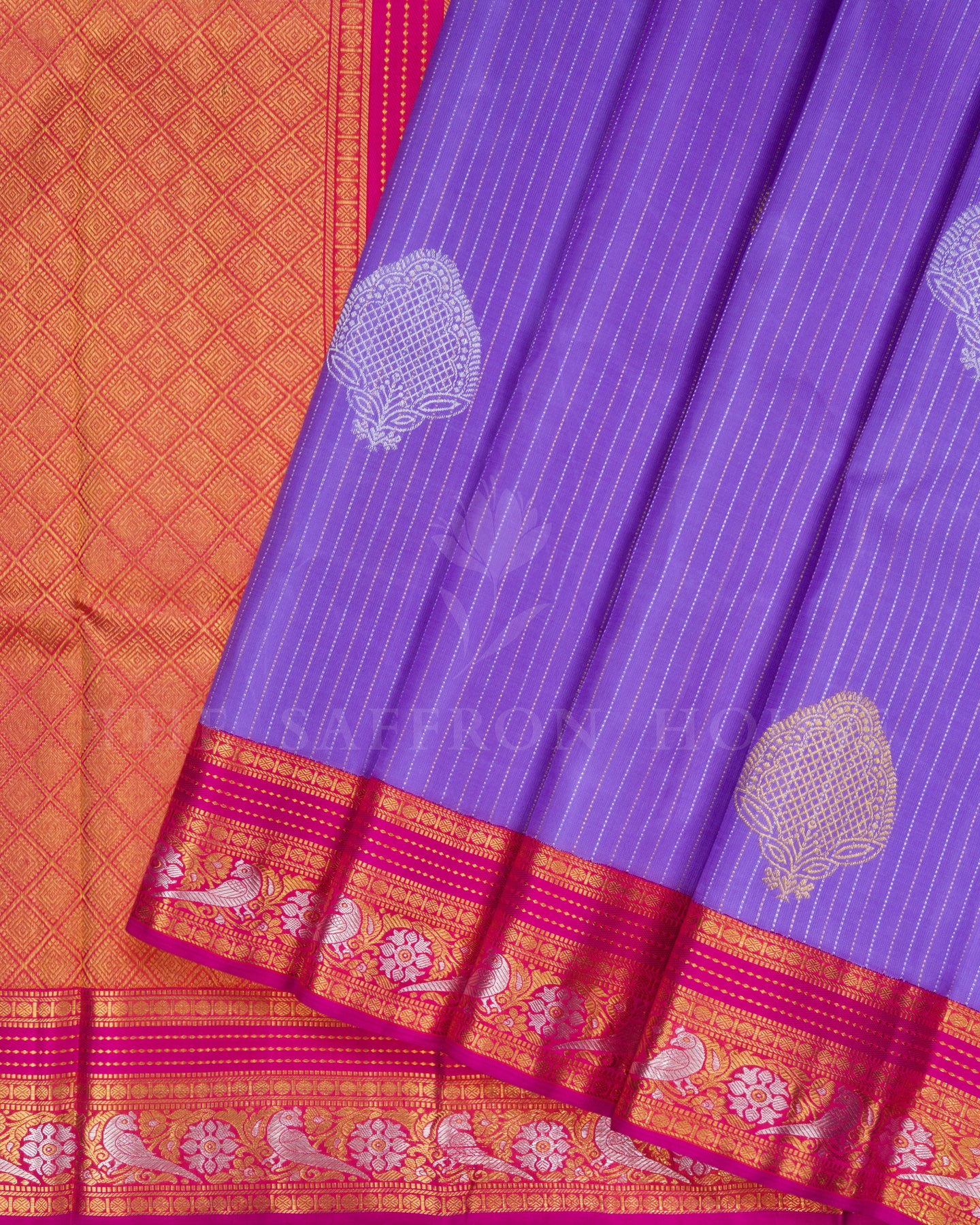 A lavender Kanjivaram silk saree with silver and gold motifs, complemented by a magenta pink zari border and an orangish pink brocade pallu