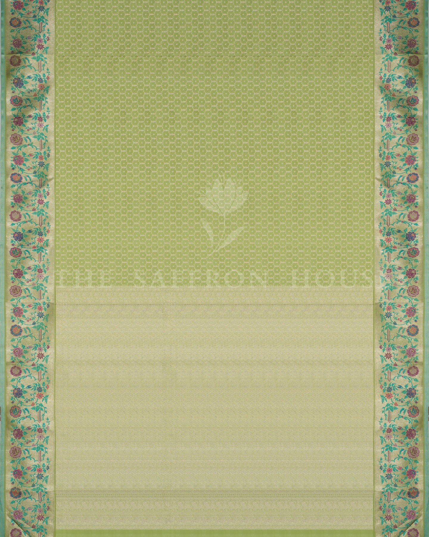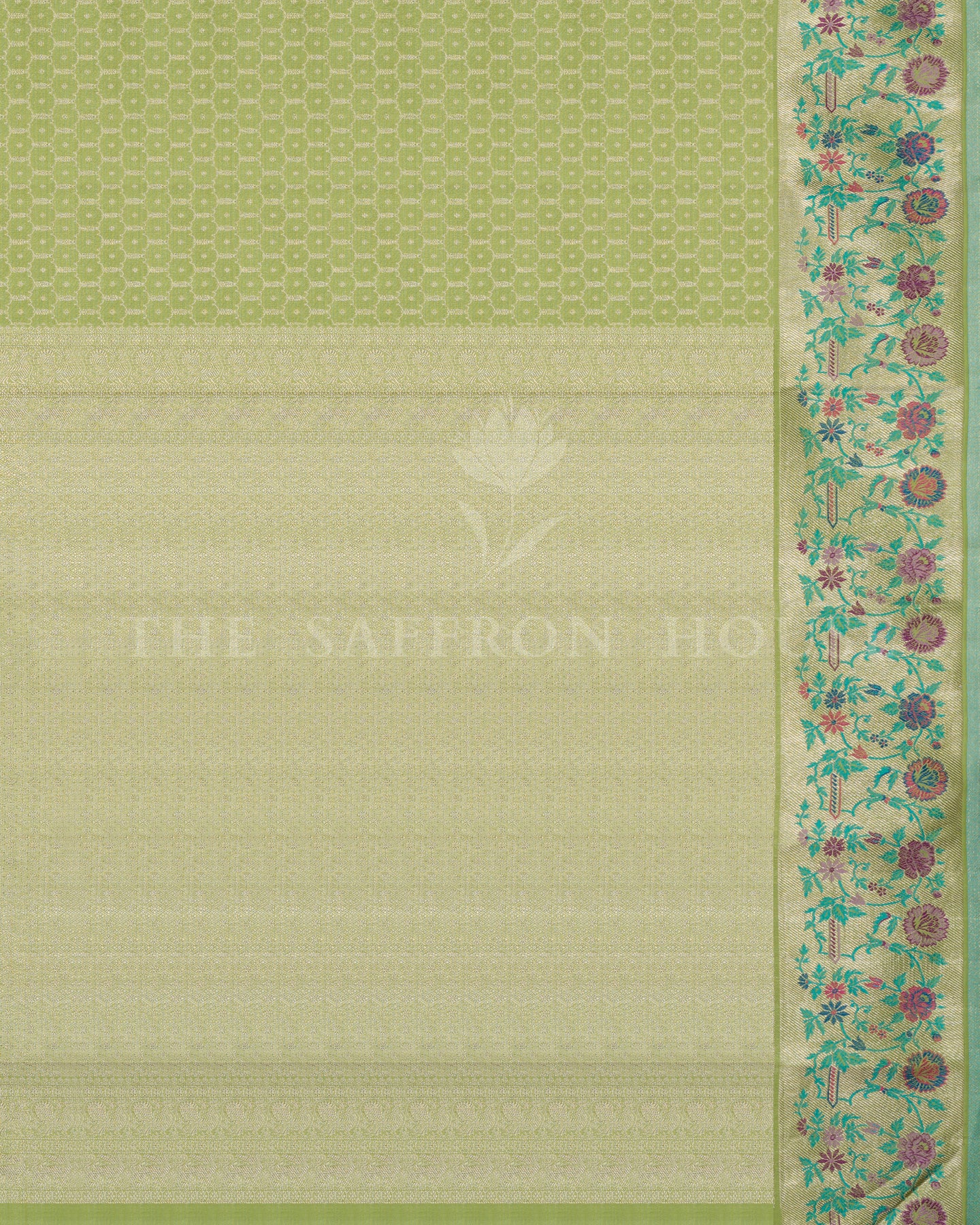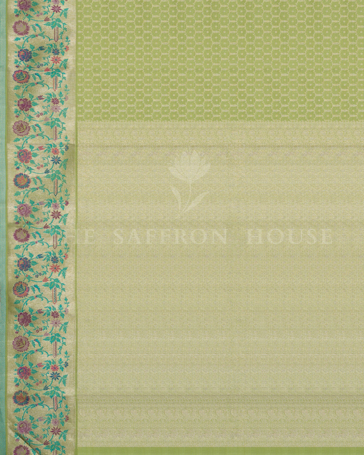 Some colours hold memory. Pista Green — radiant in its own quiet way — becomes something entirely new when woven into pure Kanjivaram silk. This Handwoven saree carries that colour with quiet authority and grace.