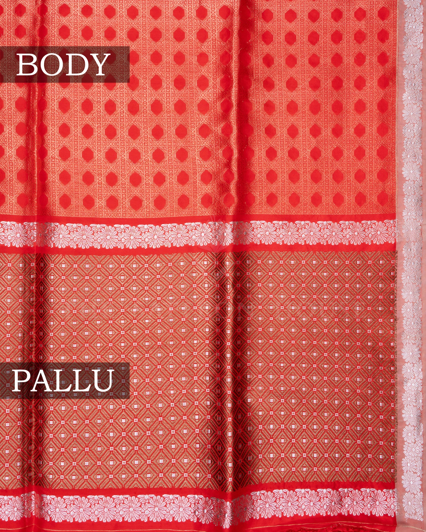 Radiating festive elegance, this Banarasi Silk saree comes in a rich orange body, intricately woven with a gold zari geometric brocade, accentuated by silver and copper zari polka dots and delicate floral design motifs — a perfect blend of traditional intricacy and contemporary flair. The subtle light peach border is adorned with silver floral weaving, adding a soft contrast that enhances the saree’s richness. The orange pallu continues the grandeur with silver and copper zari geometric brocade, creating a cohesive, eye-catching finish. Paired with an orange blouse featuring striped designs and a zari border, this saree is ideal for weddings, festive occasions, or any celebration where tradition meets glamour.