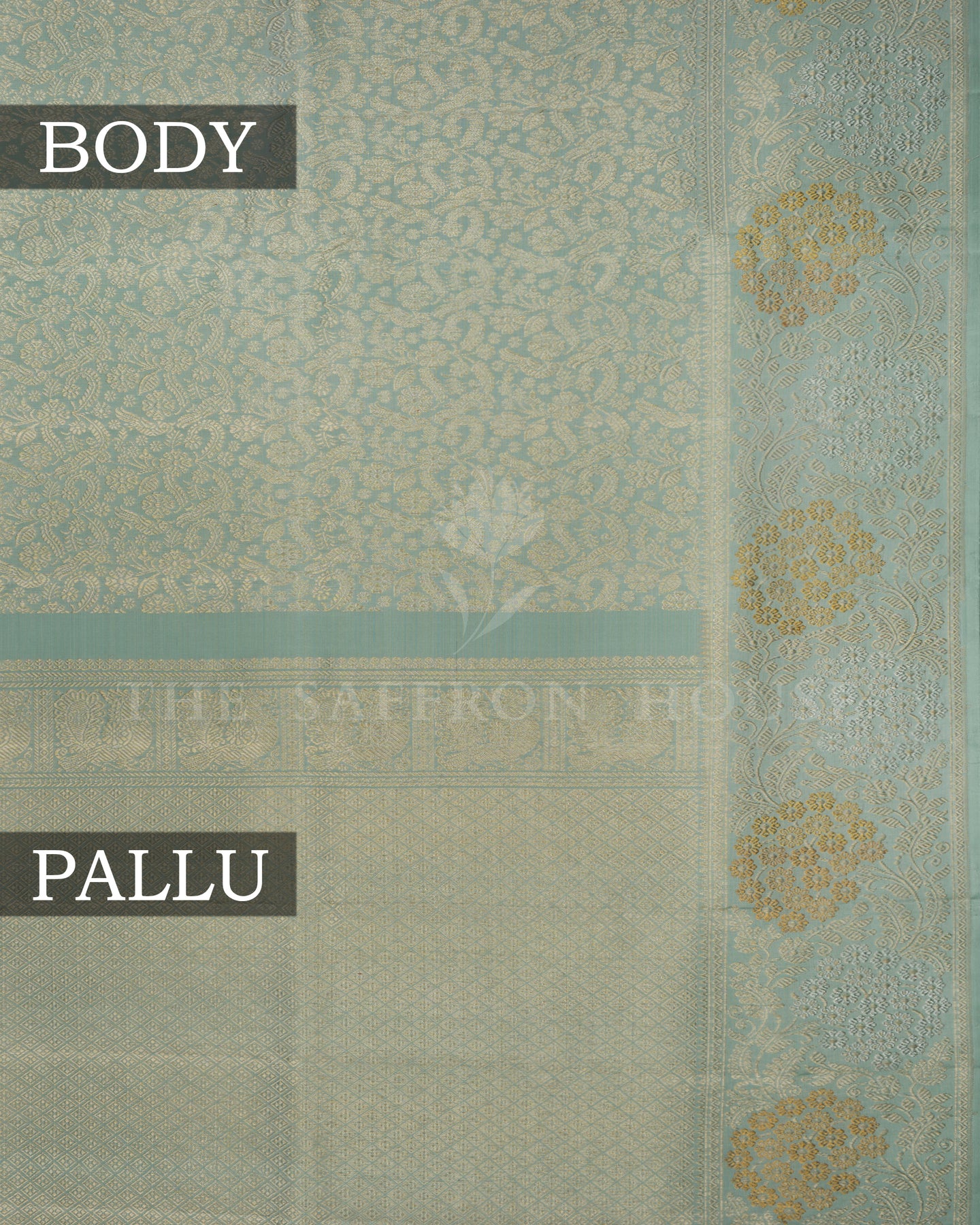 Powder Blue Kanjivaram Silk Saree Adorned With Silverish Gold Zari Floral Jaal And Regal Peacock Motifs