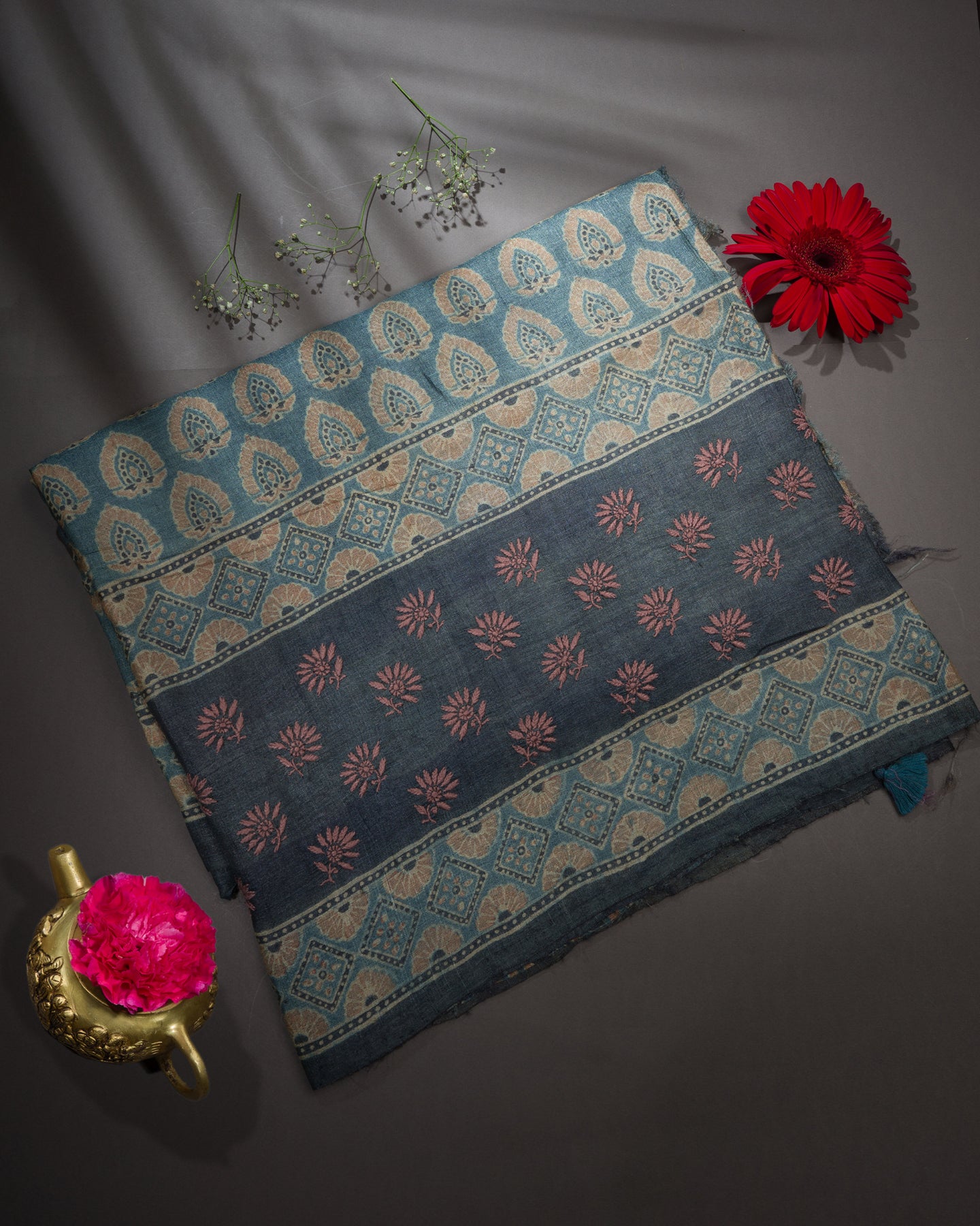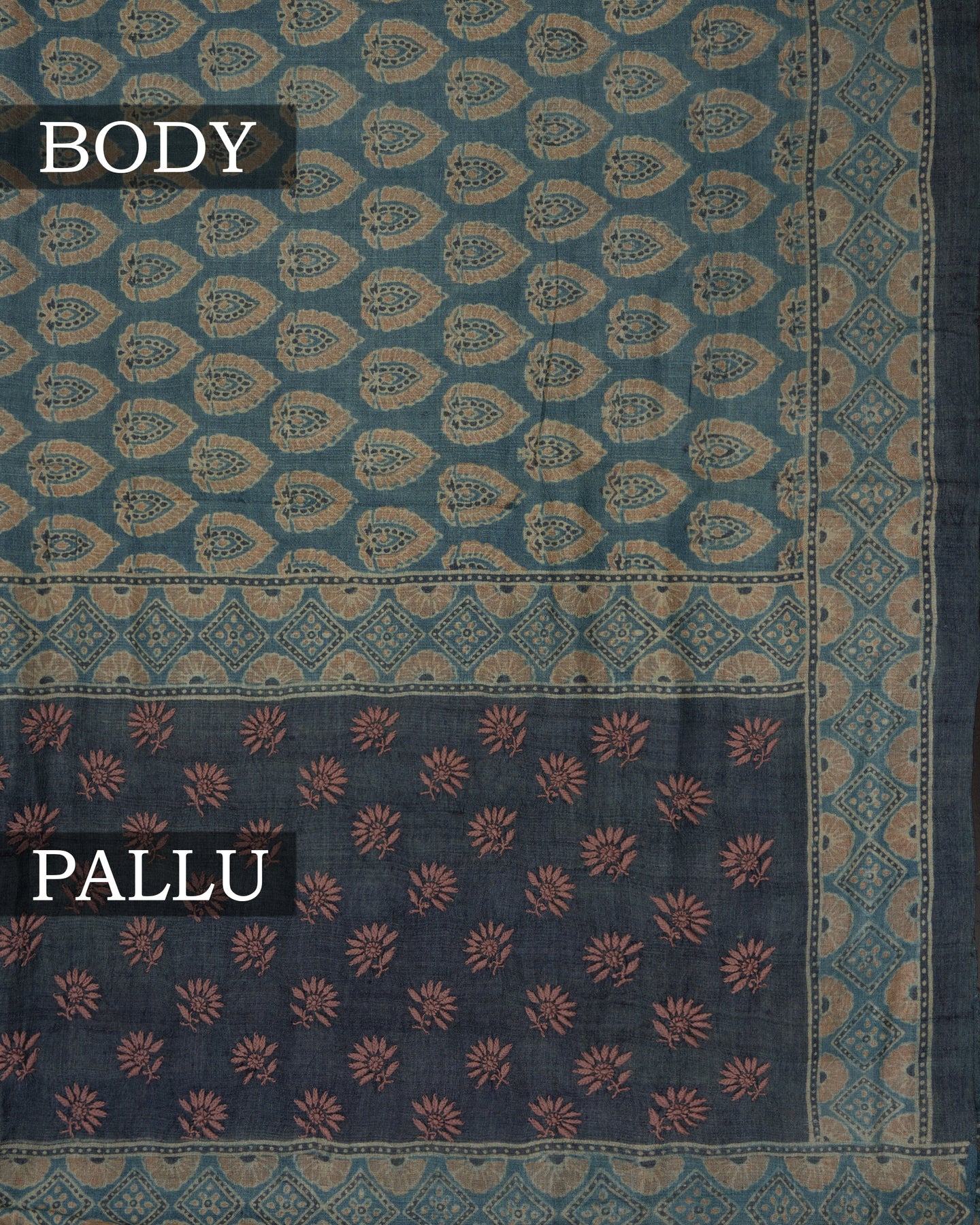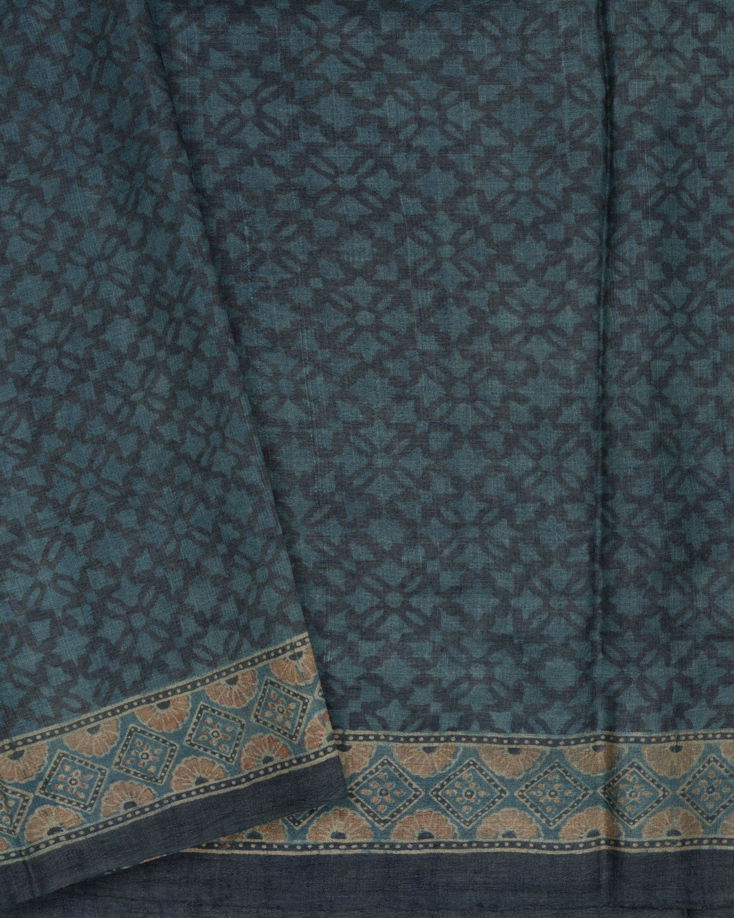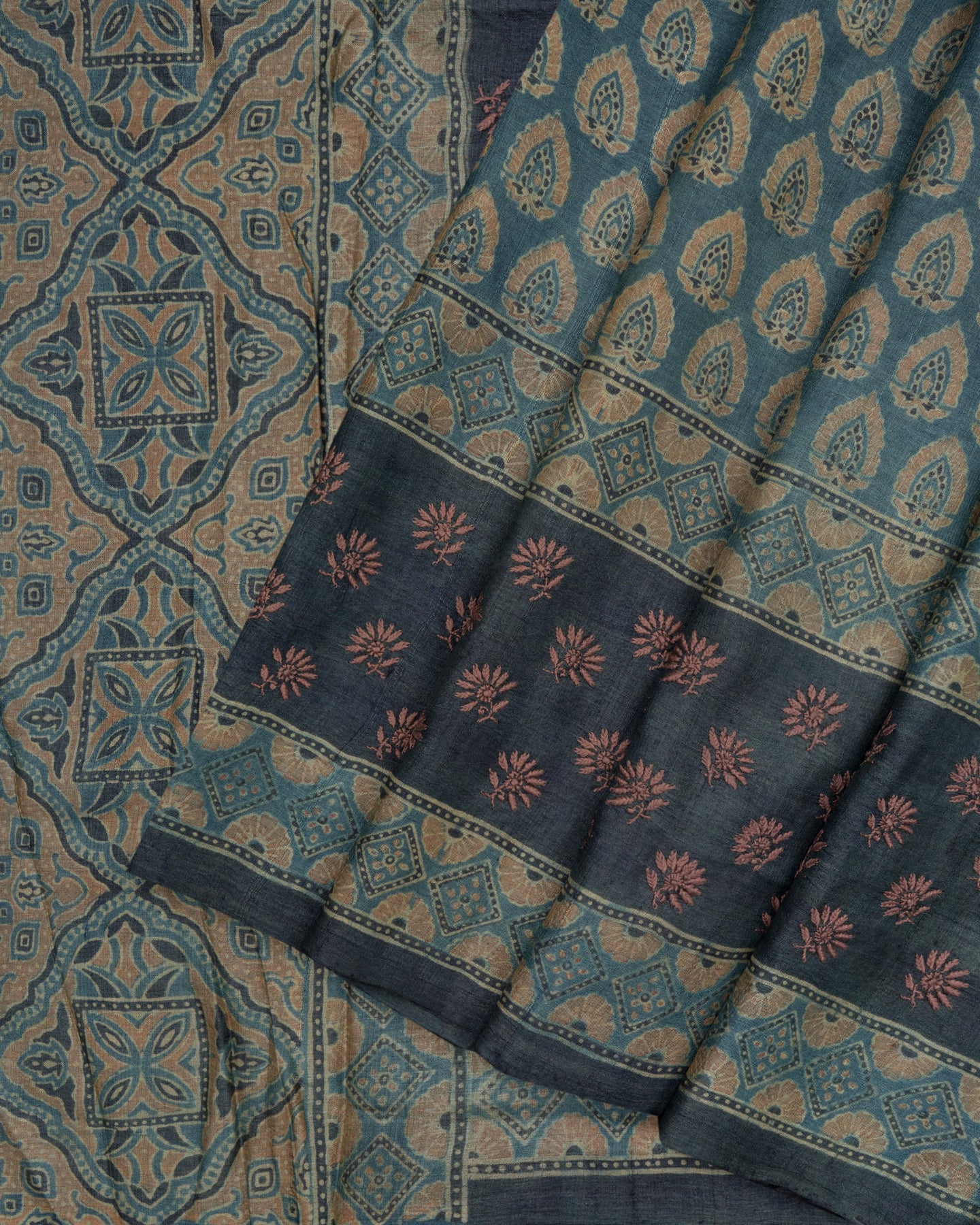 Blue Green Tussar Silk Saree Featuring Timeless Ajrakh Print With Self-Coloured Border Accented By Hand Embroidery And A Coordinated Printed Pallu.