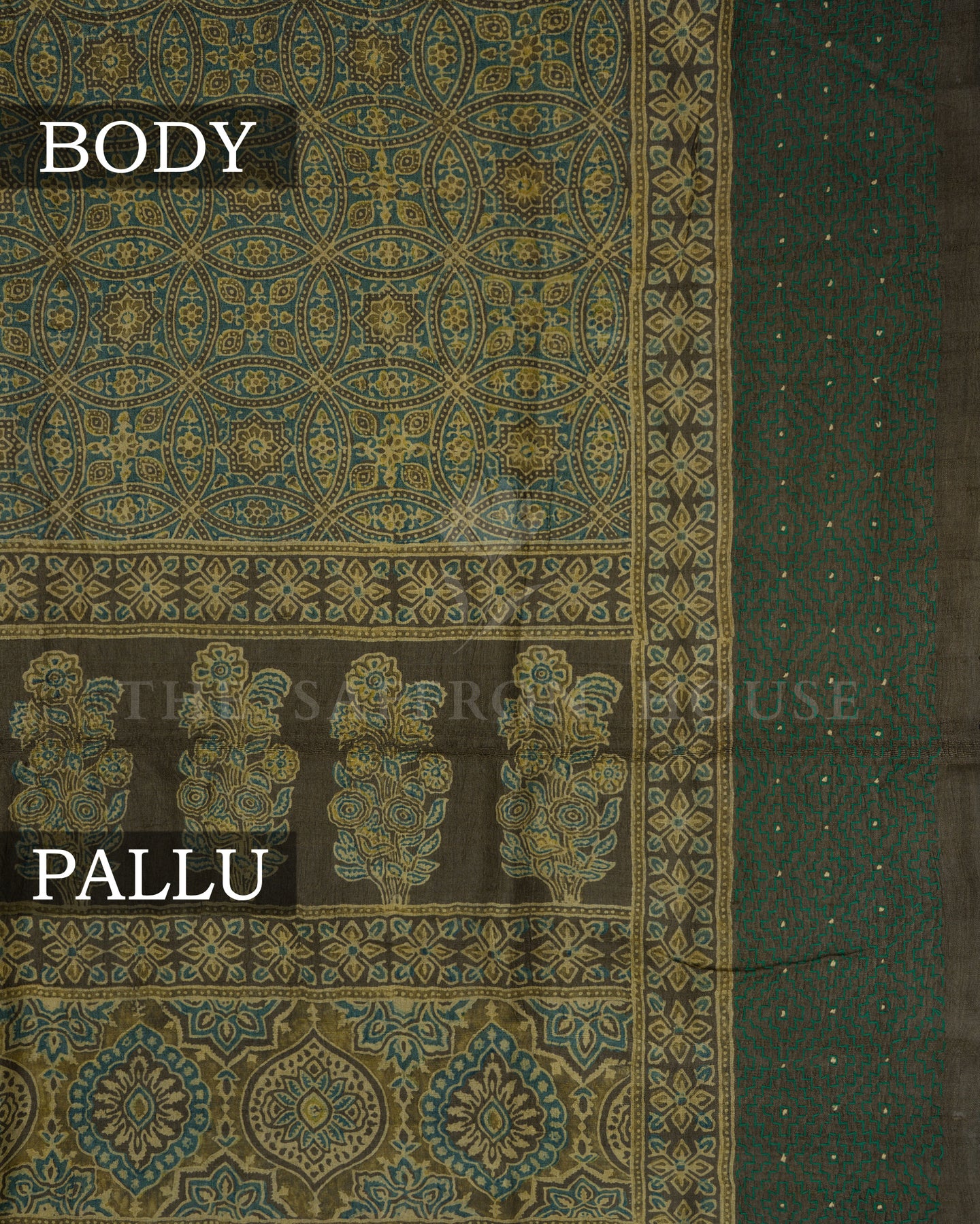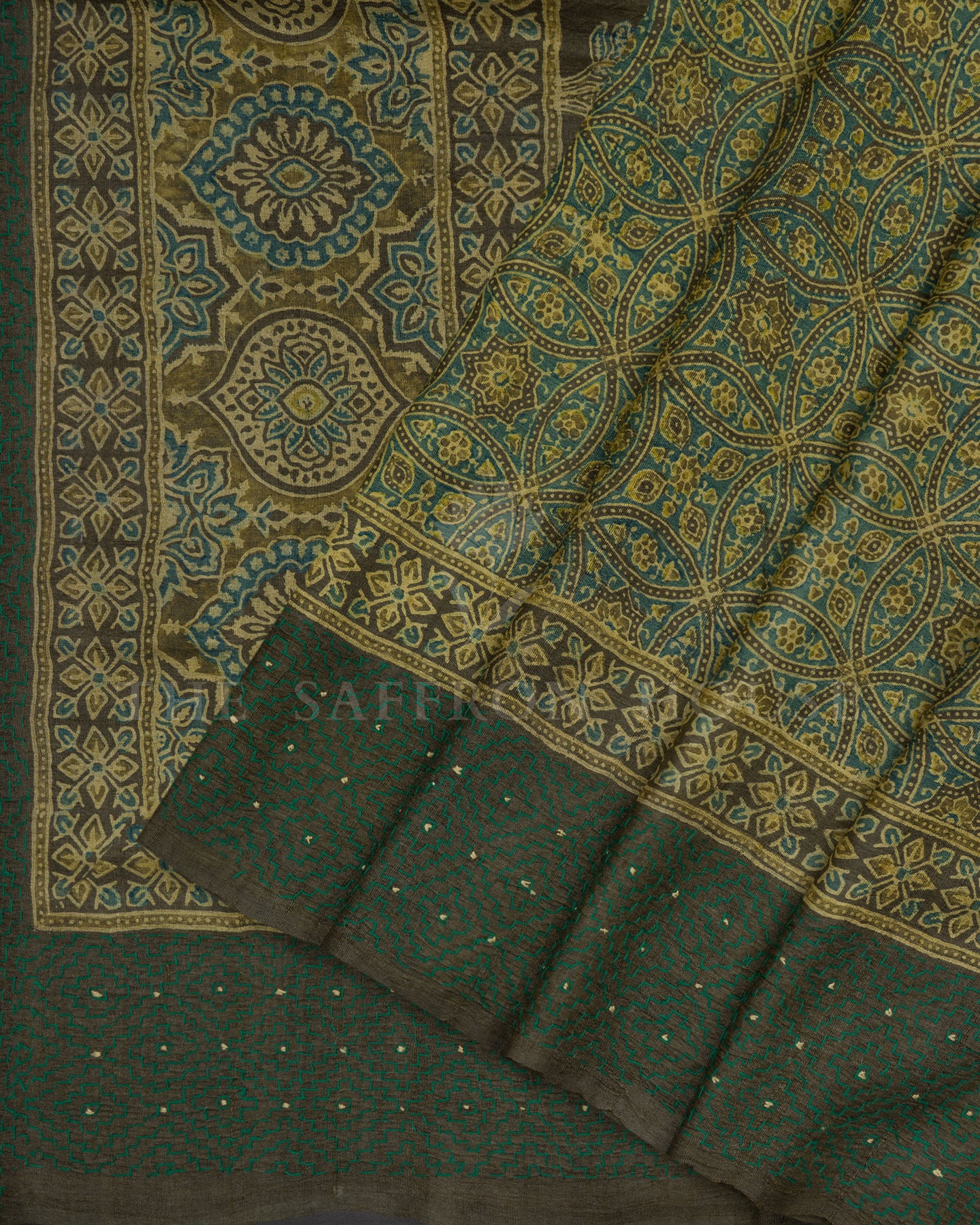 Celebrate tradition with a contemporary twist in this Olive Green Tussar Silk Saree, featuring a classic Ajrakh print that exudes artisanal elegance. The saree’s self-coloured border is enhanced with intricate Kata work, adding depth and texture to the drape.