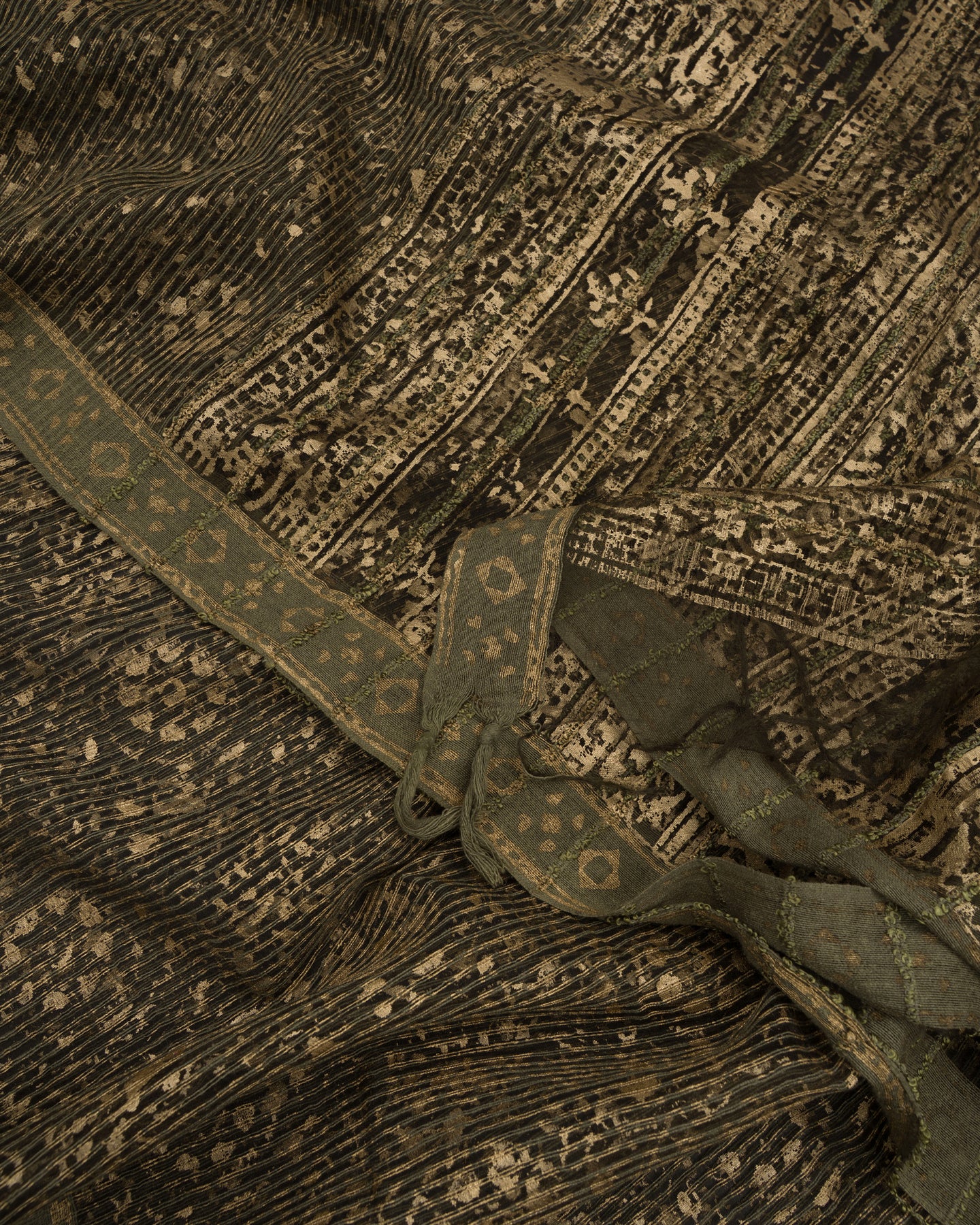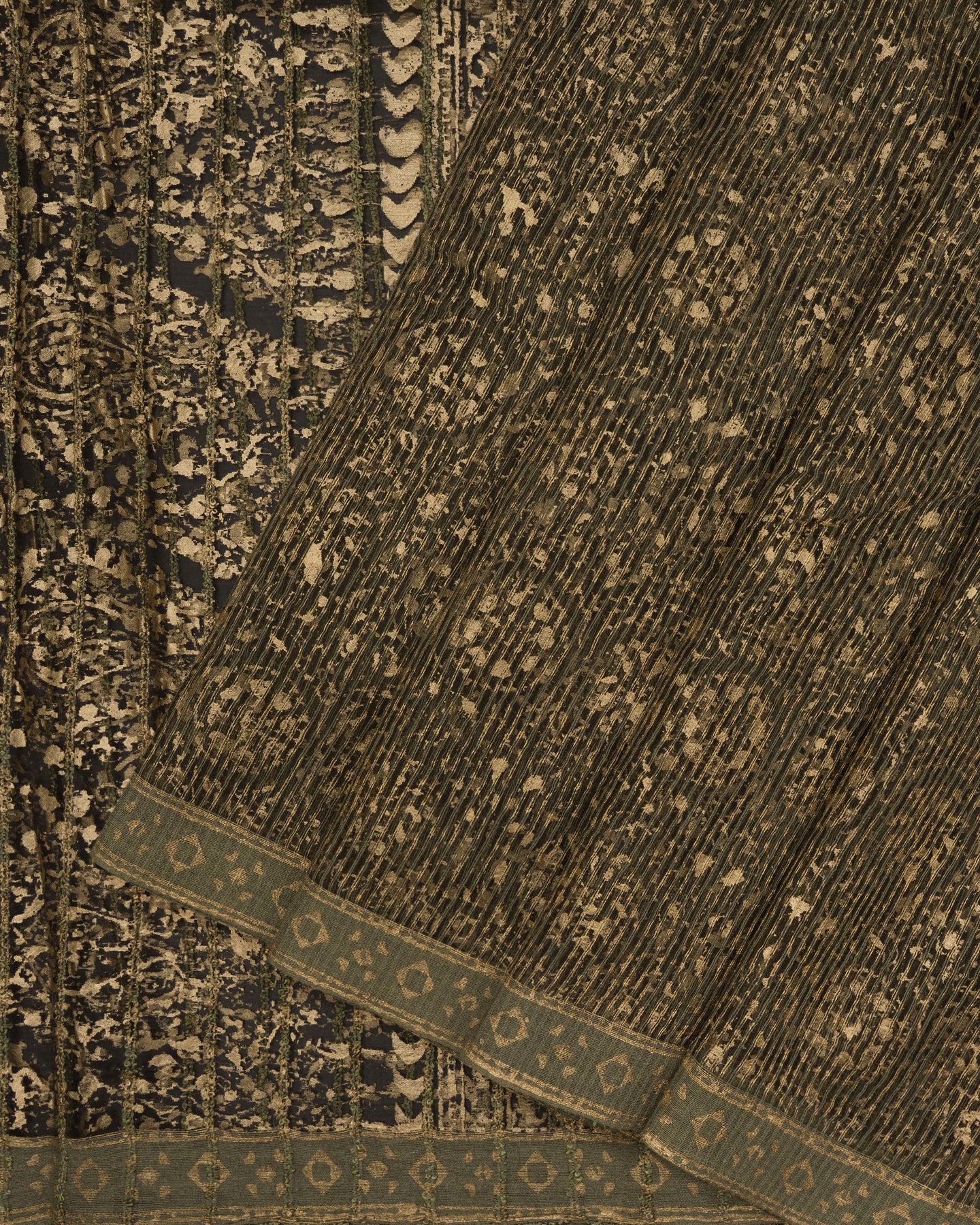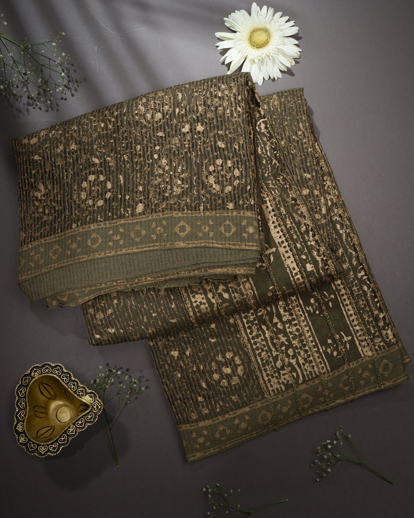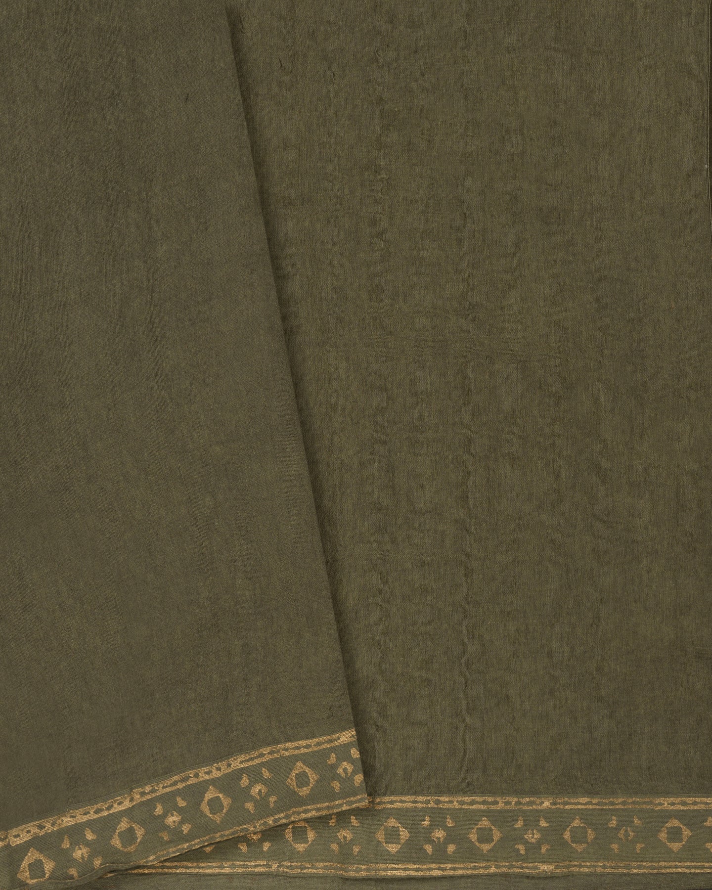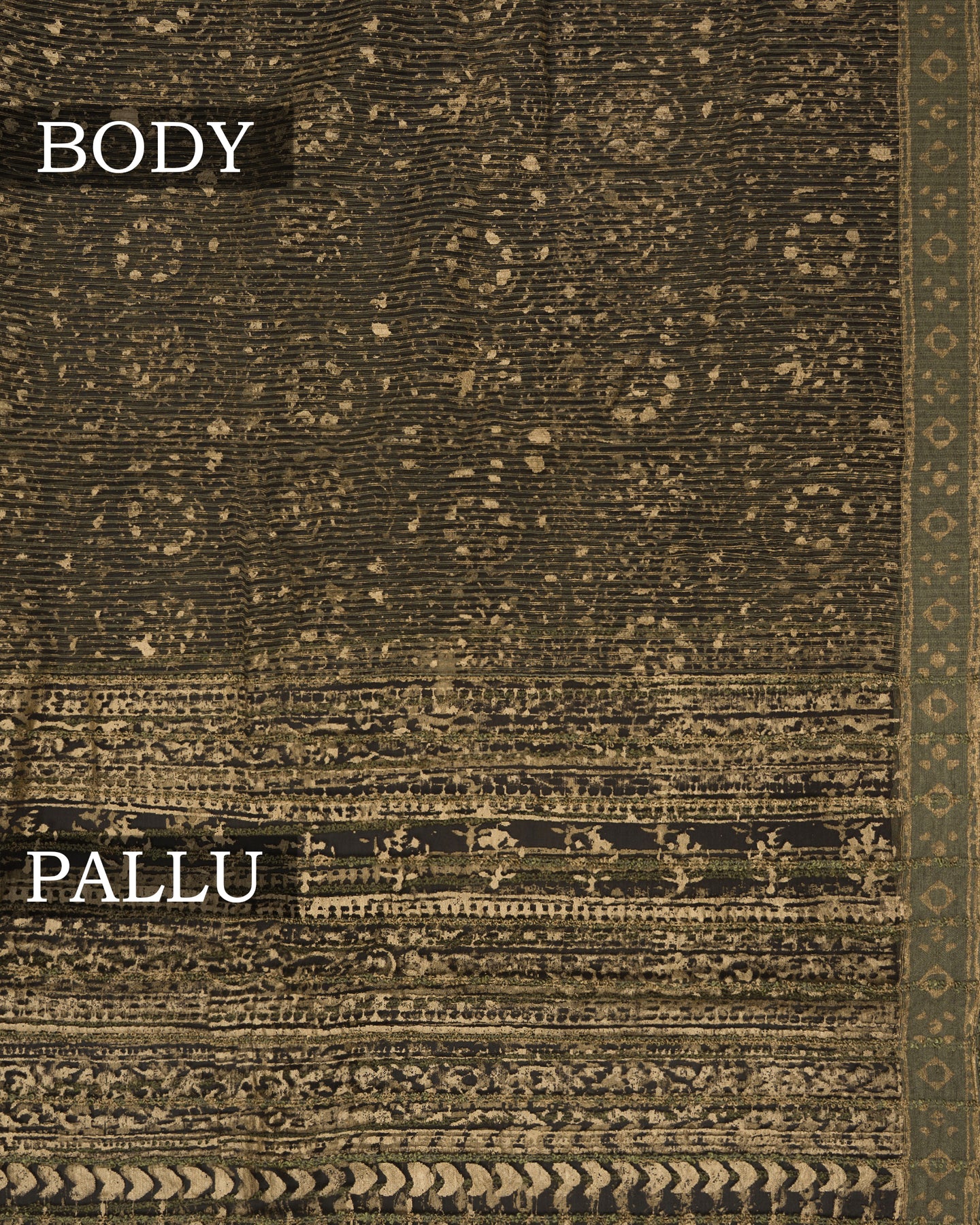 A sophisticated Olive Green Tussar Organza saree featuring delicate hand block prints and golden zari accents for understated luxury.