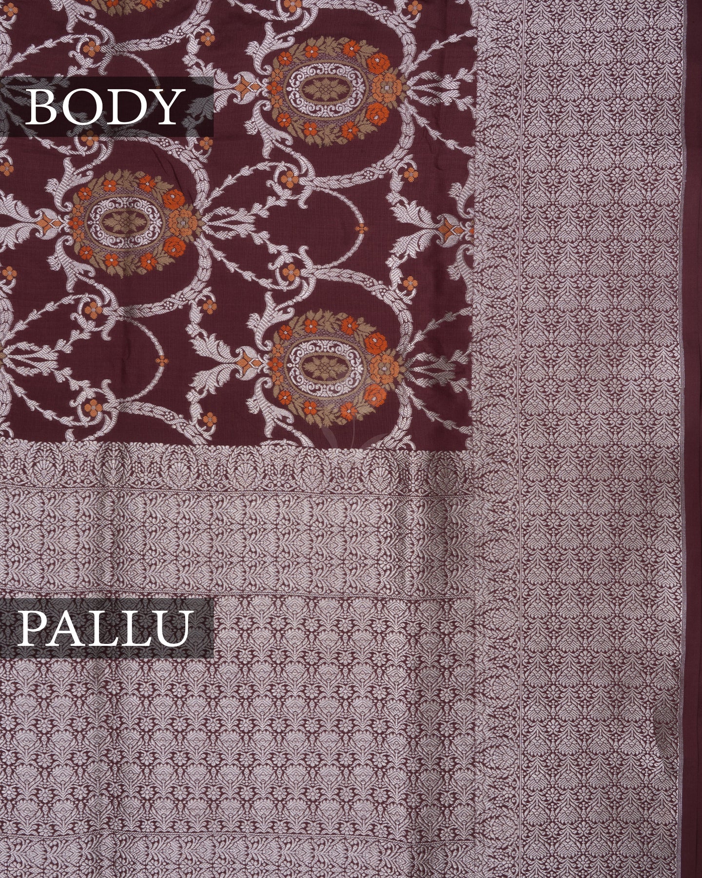 Chocolate Brown Banarasi Silk Saree With Silver And Gold Meenakari Jal Motifs And a Rich Silver Zari Brocade Border With a Matching Brocade Pallu And a Plain Blouse With Border.