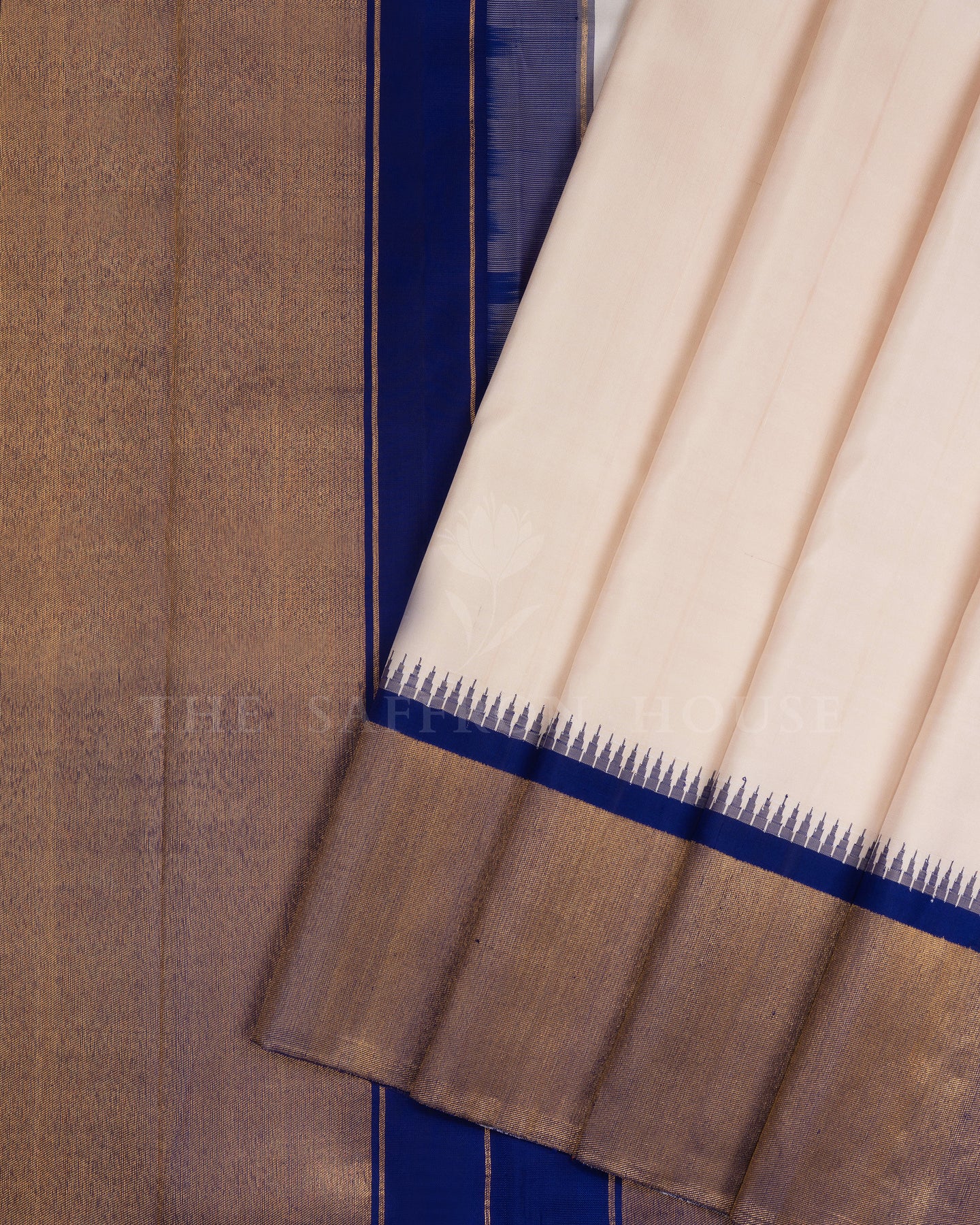The body is adorned with plain, each thread placed with precision and purpose. The navy blue border frames the drape with confident definition, while gold zari runs through the weave, catching light the way temple gold does — slowly, deeply, unforgettably.
