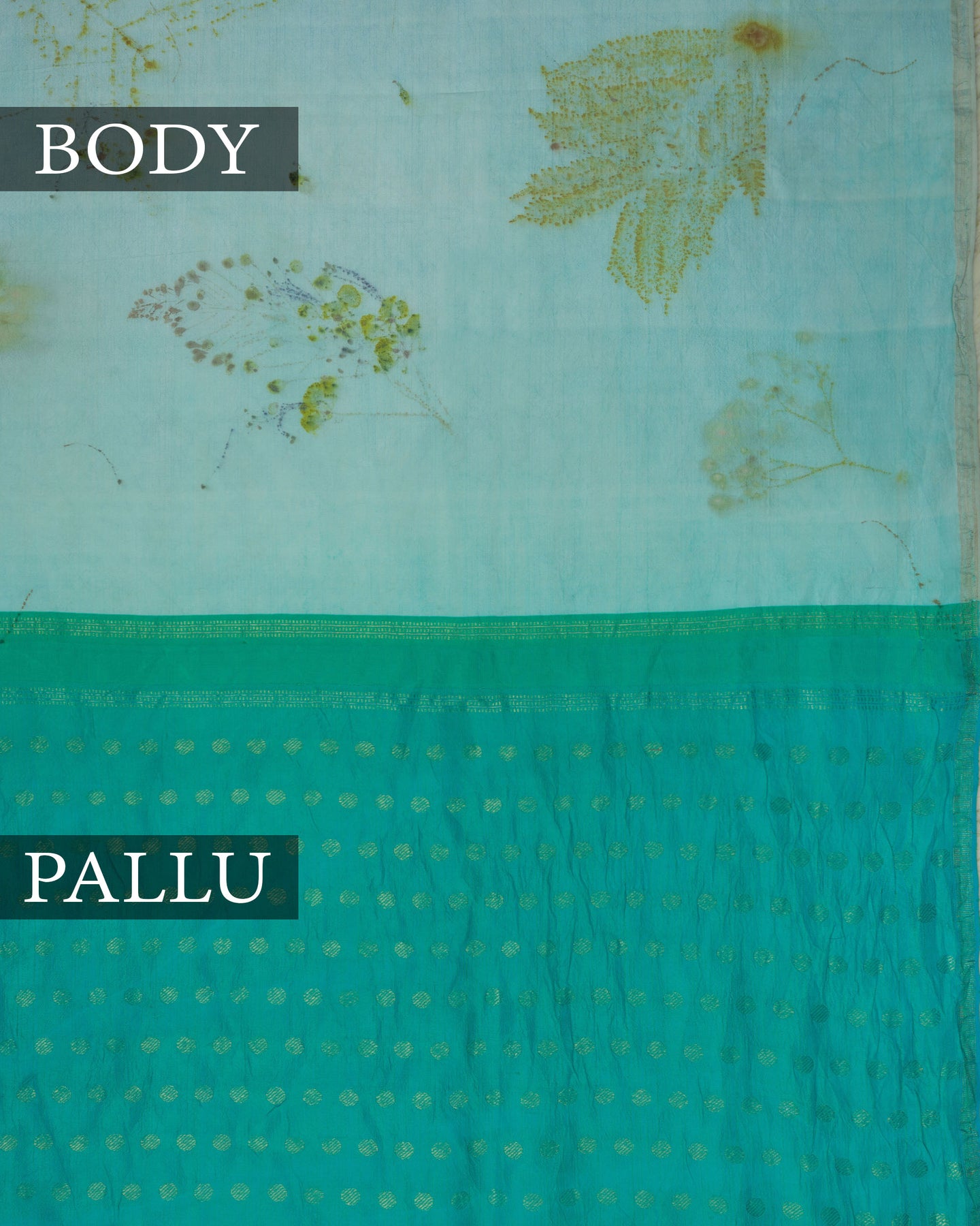 The body is adorned with organic eco leaf & flower print, each thread placed with precision and purpose. The mint blue border frames the drape with confident definition, while real zari runs through the weave, catching light the way temple gold does — slowly, deeply, unforgettably.