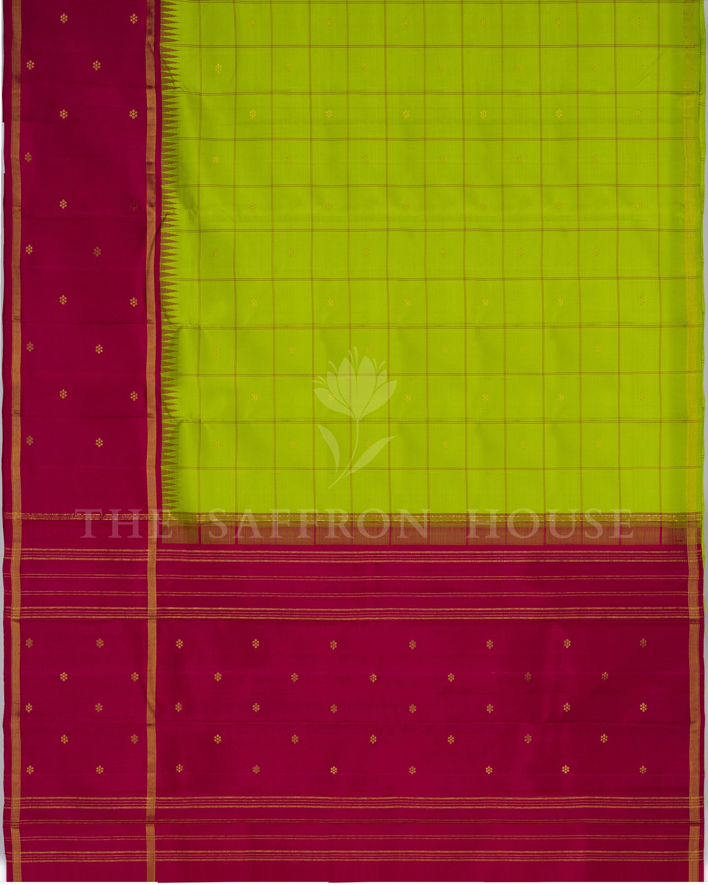 Parrot Green Kanjivaram Silk Saree with broad checks, paired with a pink border and pallu adorned with floral buttas, and a plain pink blouse with matching border.