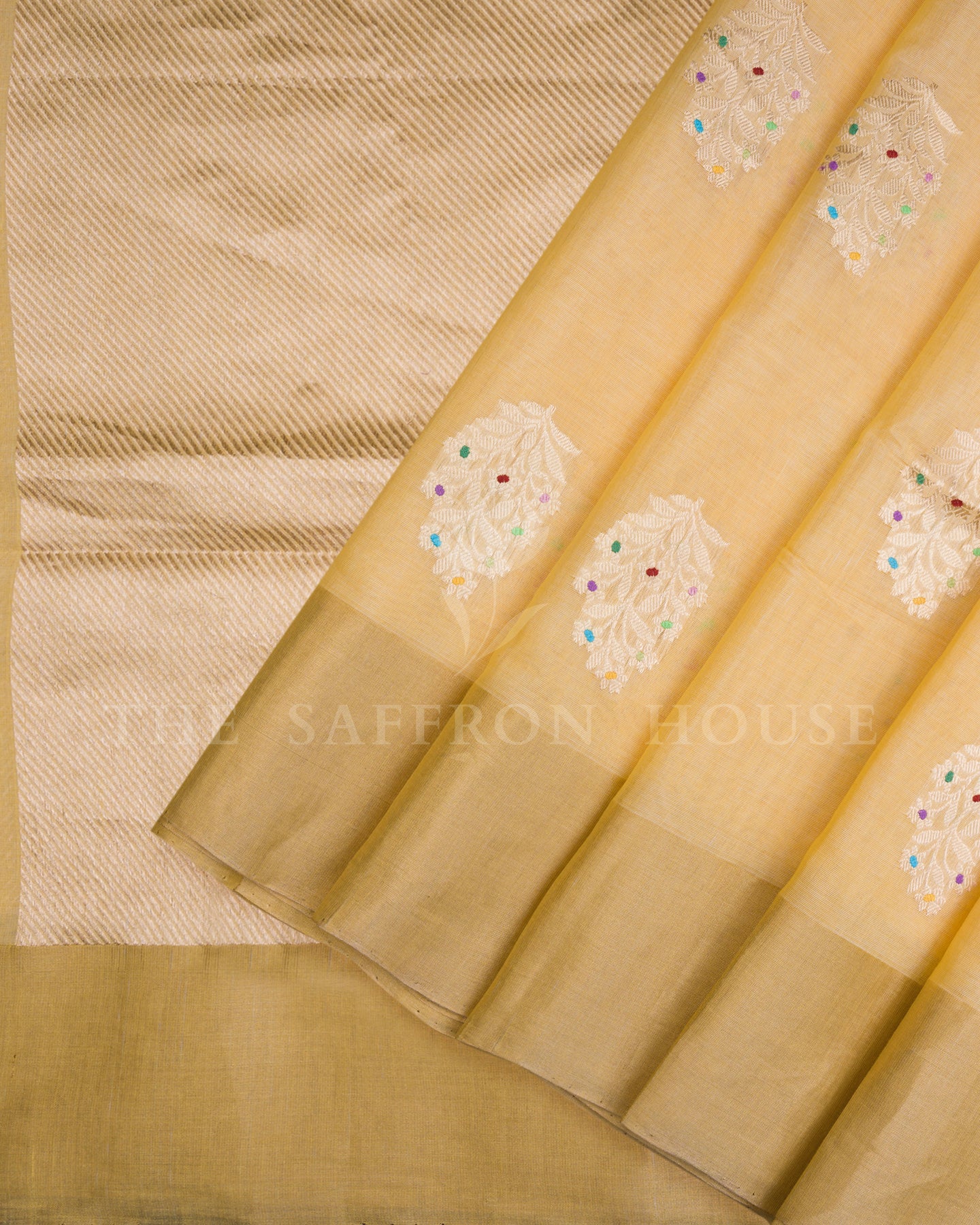 Banaras cotton-silk saree in almond beige with zari floral buttas and meenakari-style resham accents. Finished with a muted golden tissue border and softly lustrous diagonal zari pallu.