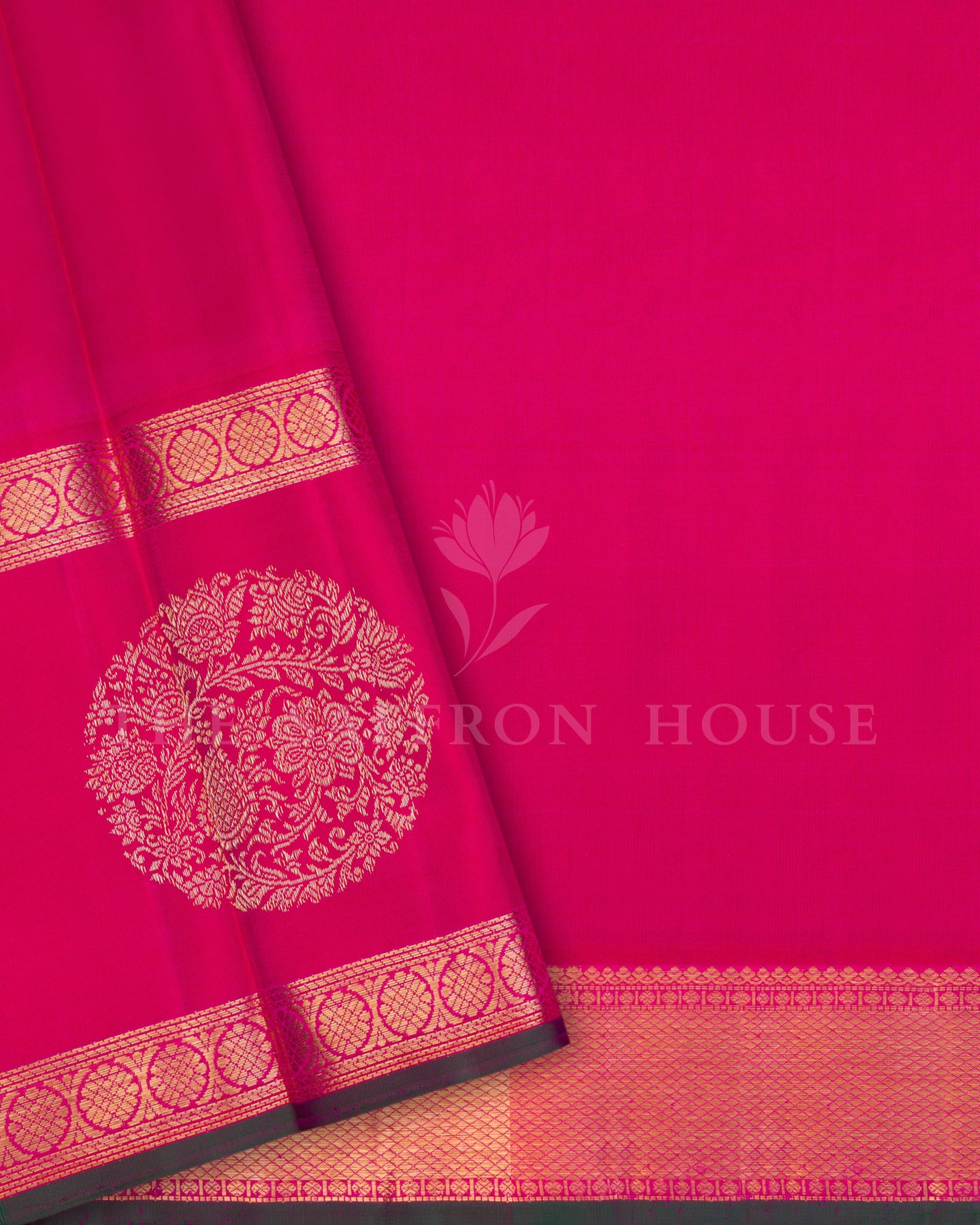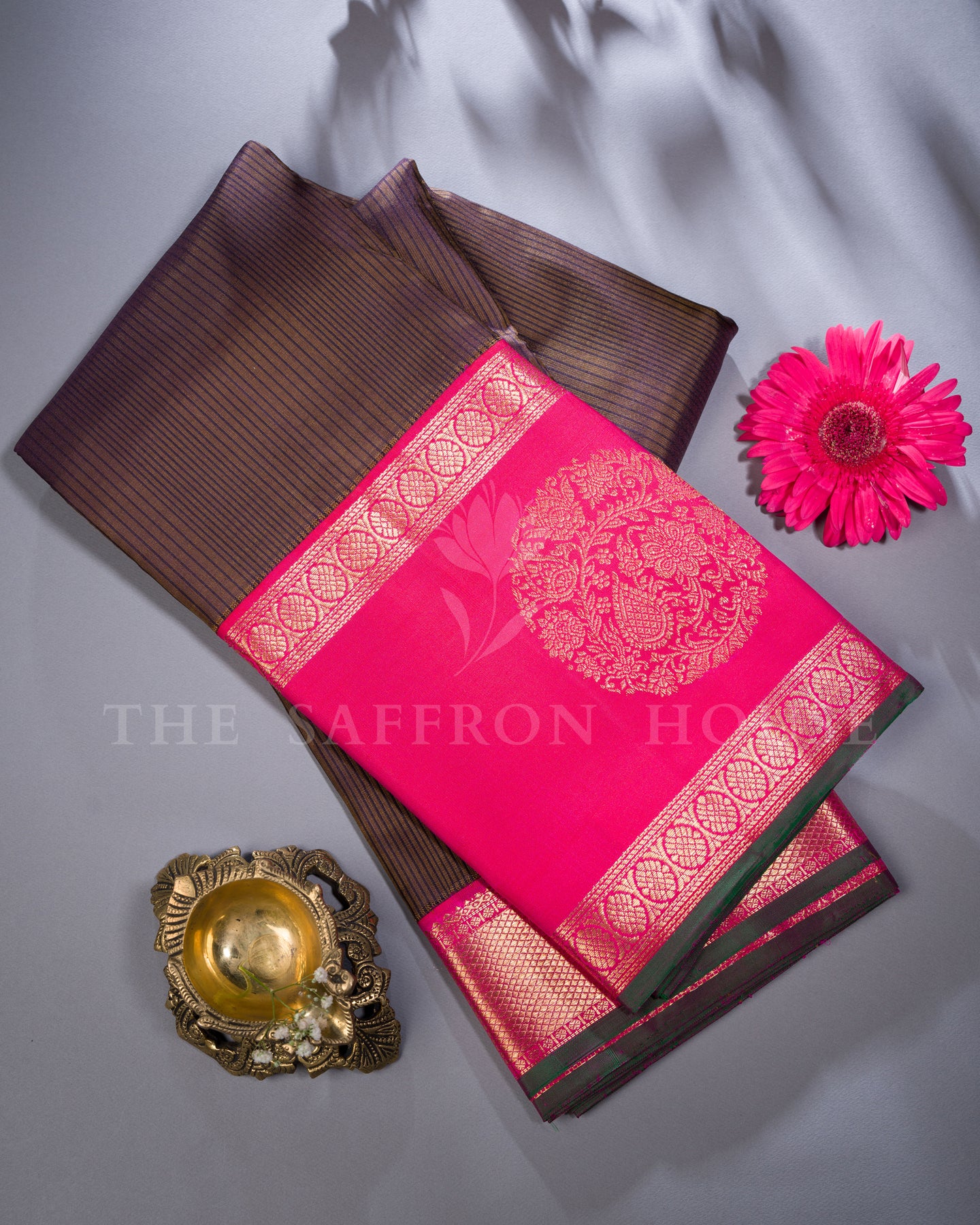 Crafted for the Goddess in you, this Regal Kanjivaram Silk Saree from The Saffron House is Heritage woven in silk and gold. The earthy brown body features beautiful cluster stripes woven with black thread, creating a mesmerising impact. The contrasting Retta Pet Fuchsia Pink border with dark green selvedge features striking round floral motifs woven with gold zari. Stunning patterned diagonal stripes with bands of chakkram motifs adorn the lovely fuchsia pink pallu, exuding a look of Regal Opulance. Paired with a plain fuchsia pink silk blouse with matching border, this Gorgeous Weave is sure to make every moment ceremonial.