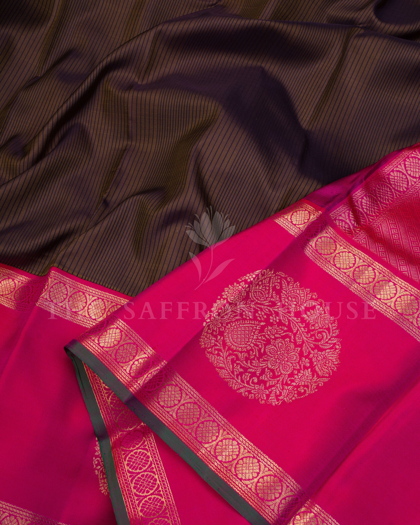 Brown Kanjivaram silk saree with black stripes, fuchsia pink rettapet border edged in green selvedge and gold floral motifs, and a pallu of diagonal stripes and chakram designs.