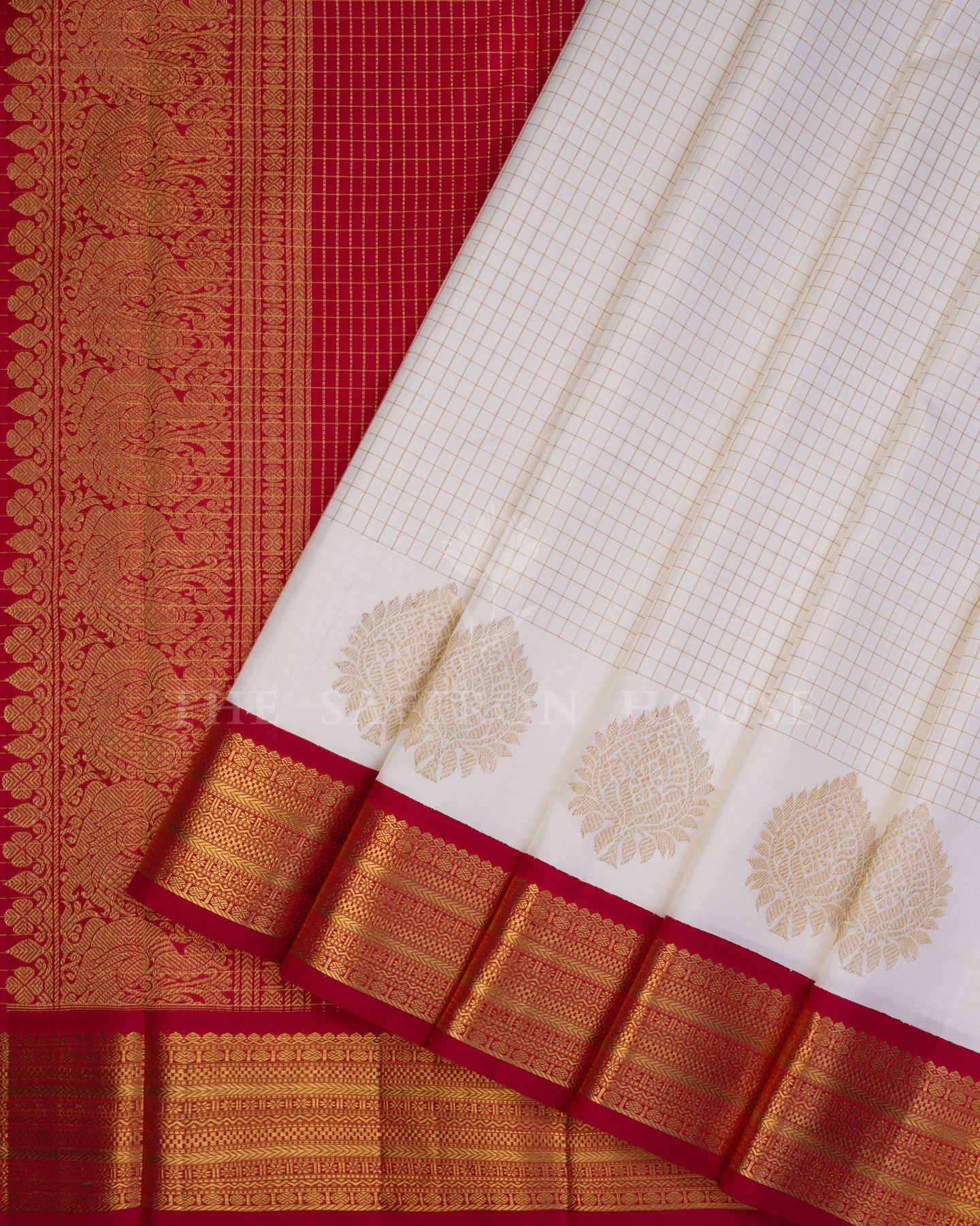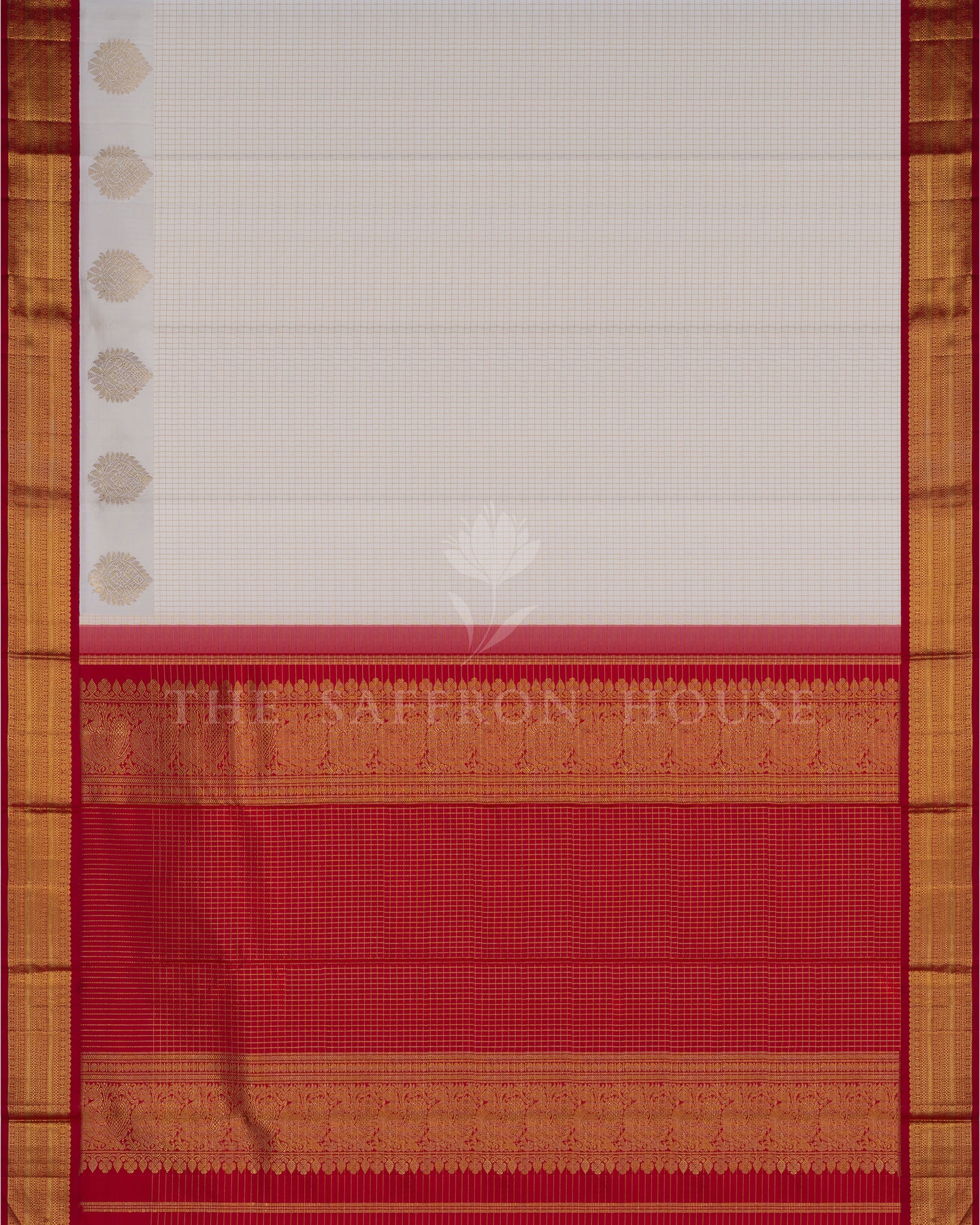 There is something about the interplay of off white and red that feels both ancient and alive. This Korvai Kanjivaram silk saree opens with radiant in its own quiet way, its surface shimmering with the unhurried rhythm of the loom.
