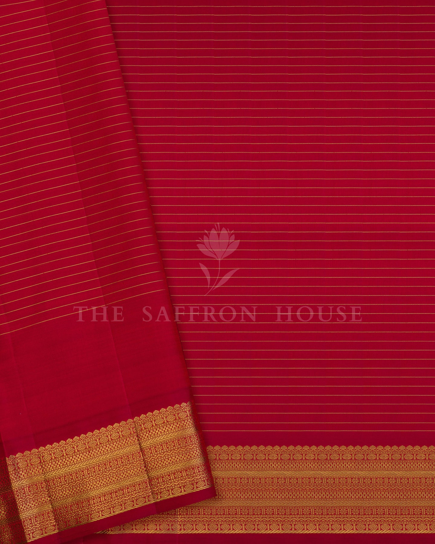 The body is woven with intricate traditional motifs, each thread placed with precision and purpose. A richly woven border frames the drape with confident definition, while gold zari runs through the weave, catching light the way temple gold does — slowly, deeply, unforgettably.