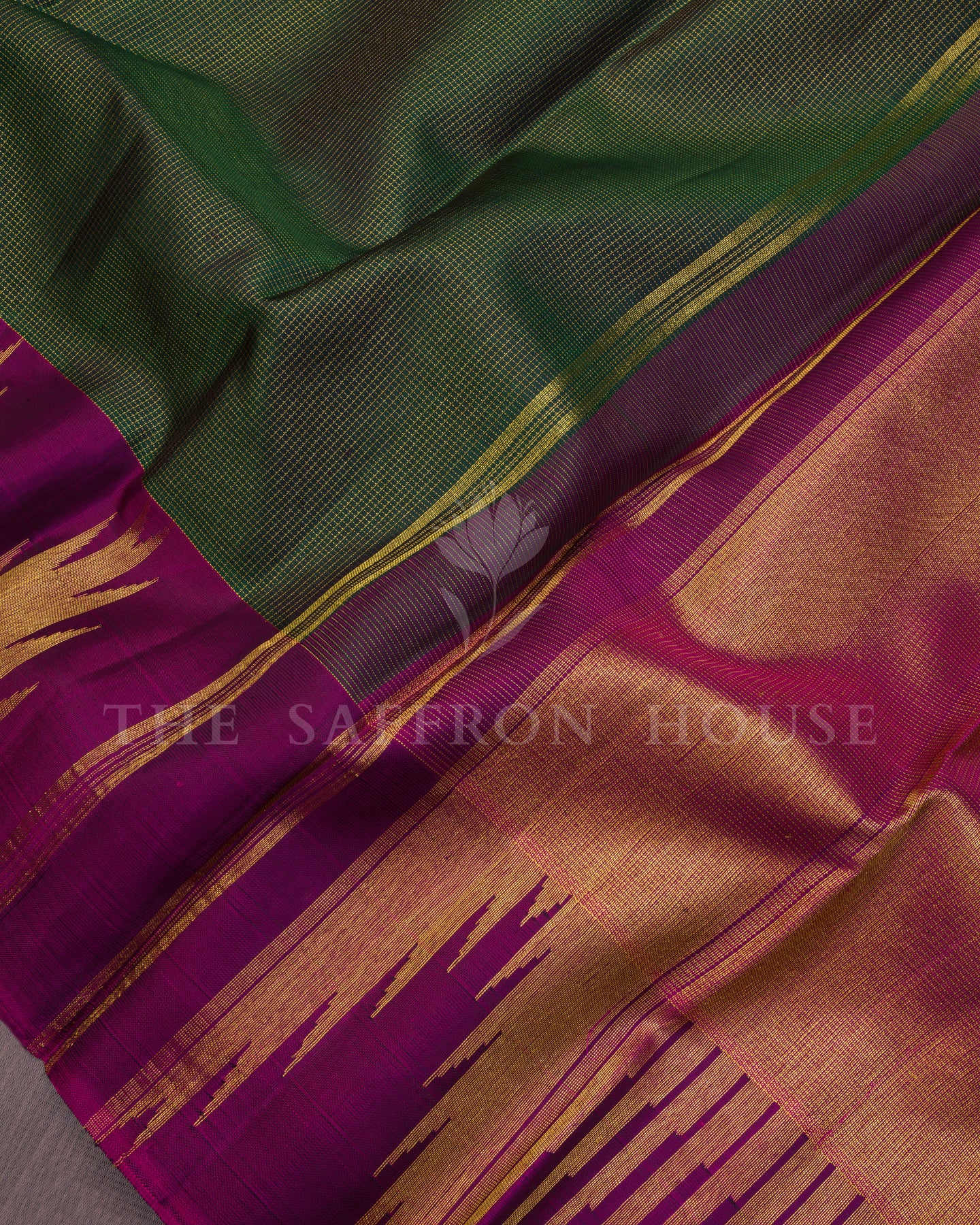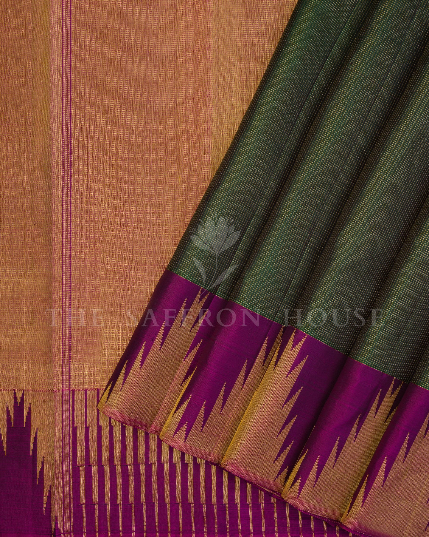 There is something about the interplay of bottle green and purple that feels both ancient and alive. This Handwoven Kanjivaram silk saree opens with deep and contemplative as forest dusk, its surface shimmering with the unhurried rhythm of the loom.