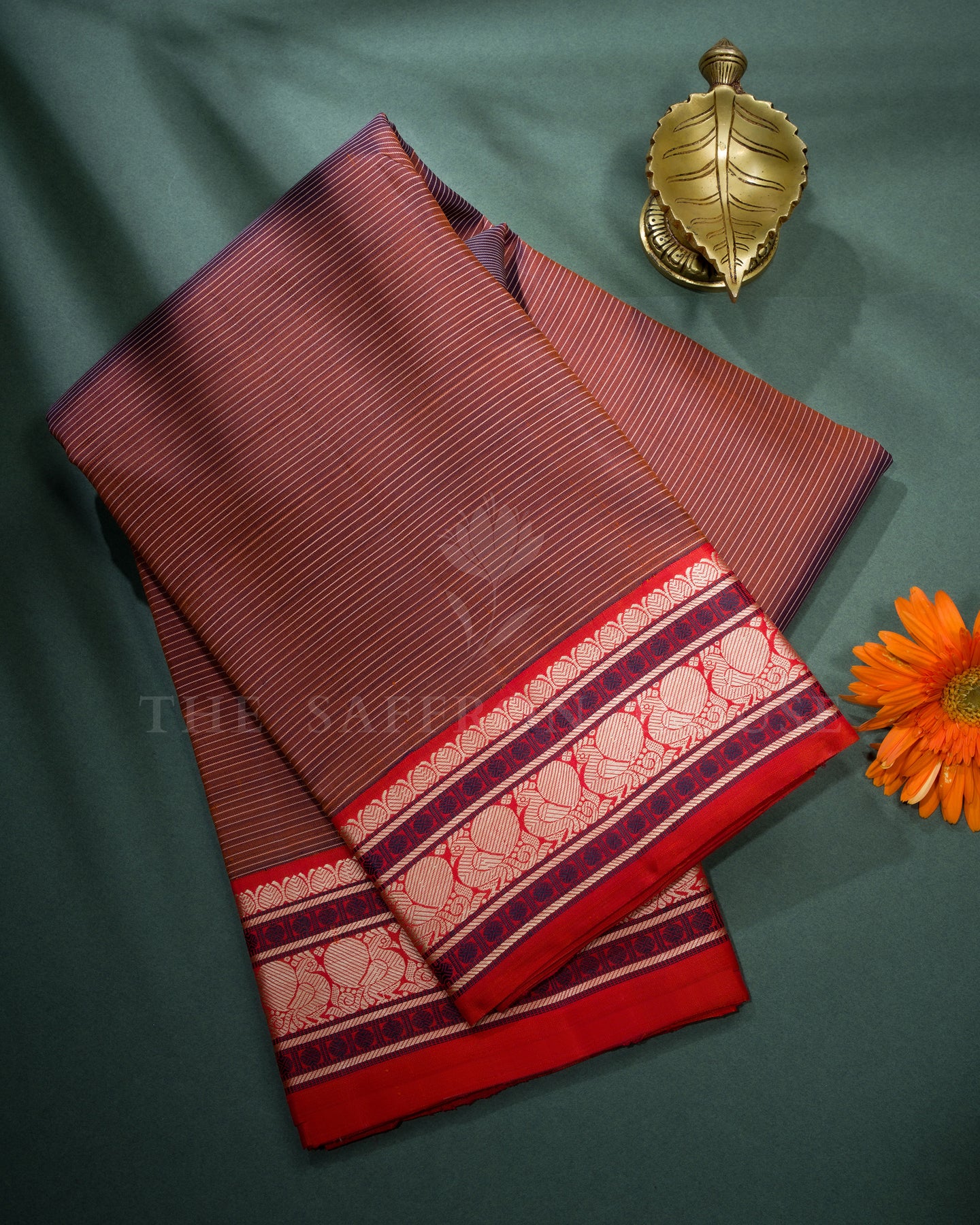 The body is adorned with horizontal small stripes, each thread placed with precision and purpose. The rust colour border frames the drape with confident definition, while gold zari runs through the weave, catching light the way temple gold does — slowly, deeply, unforgettably.