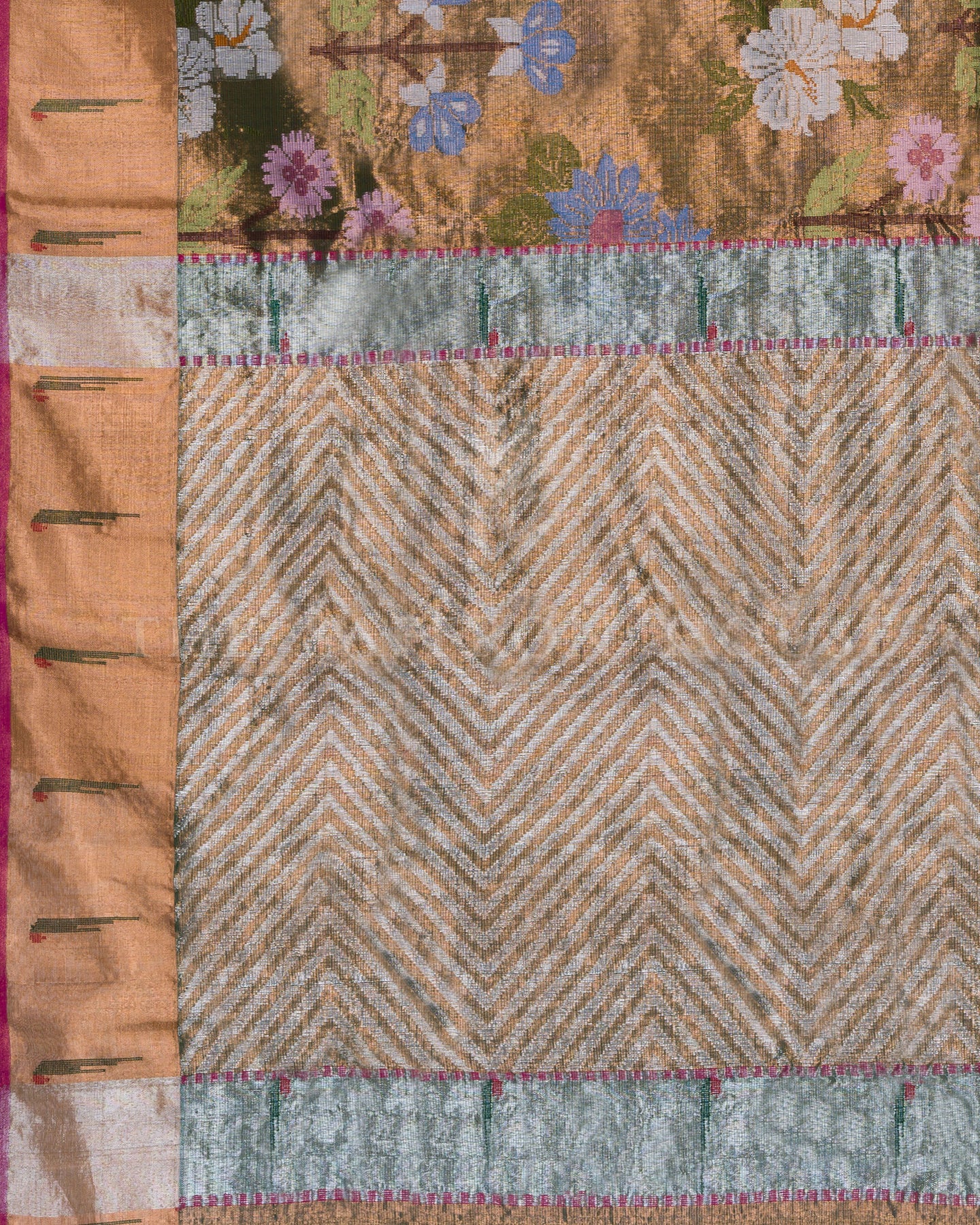 The body is woven with intricate traditional motifs, each thread placed with precision and purpose. A richly woven border frames the drape with confident definition, while silver and gold zari runs through the weave, catching light the way temple gold does — slowly, deeply, unforgettably.