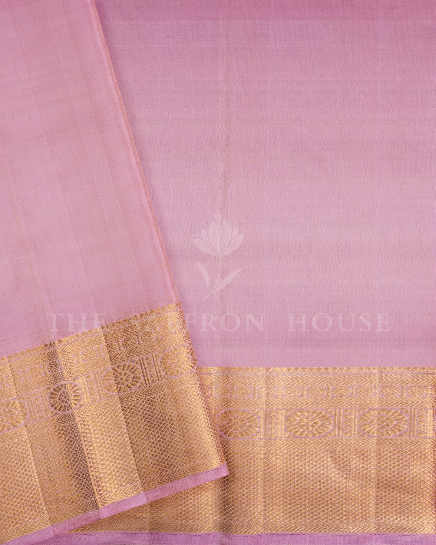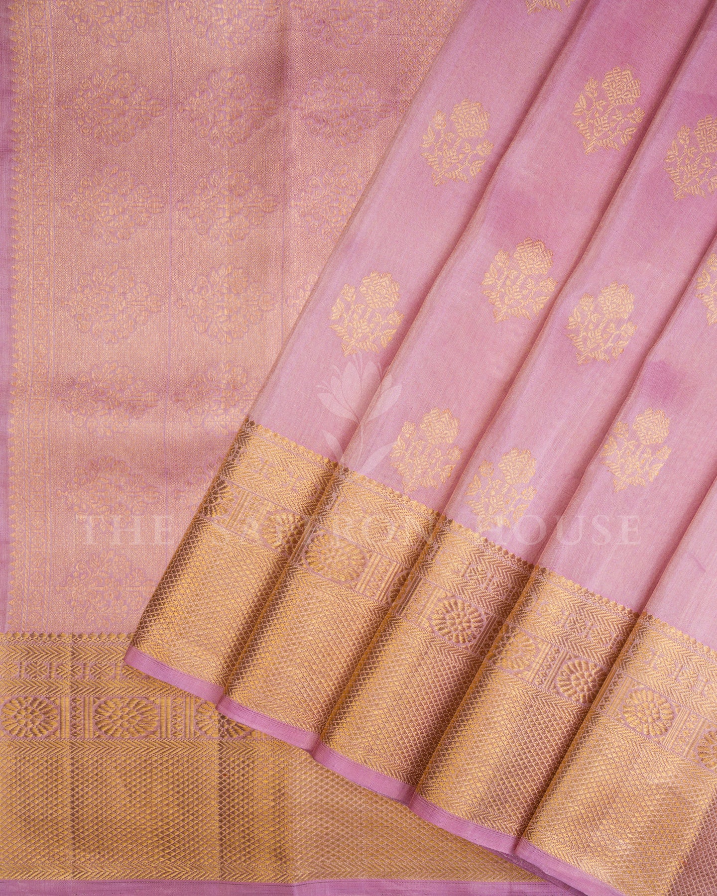 Pure Silk Tissue Kanjivaram Saree in pastel pink with gold floral buttas, korvai border with diamond and temple motifs, grand pallu.