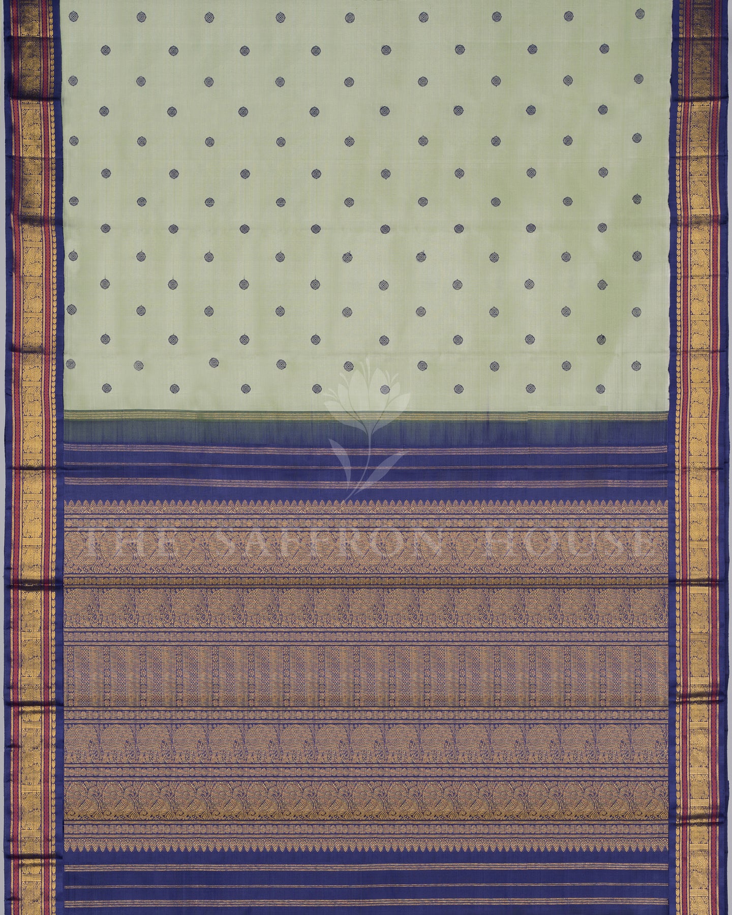 Fall in love with this Delightful Handwoven Kanjivaram Silk Saree from The Saffron House, capturing the essence of our beautiful heritage. The lovely pale pistachio green body is embellished with pretty thread woven circular buttas. The contrasting navy blue border featuring exquisite annam and manga motifs woven with gold zari with coloured highlights, exudes a classic appeal. The Rich Navy blue pallu with Pretty Peacocks, Majestic Elephants and intricate floral rows woven with gold zari, offers a look og utmost grandeur. Paired with a plain navy blue silk blouse with matching border, this Stunning Weave is a versatile choice.