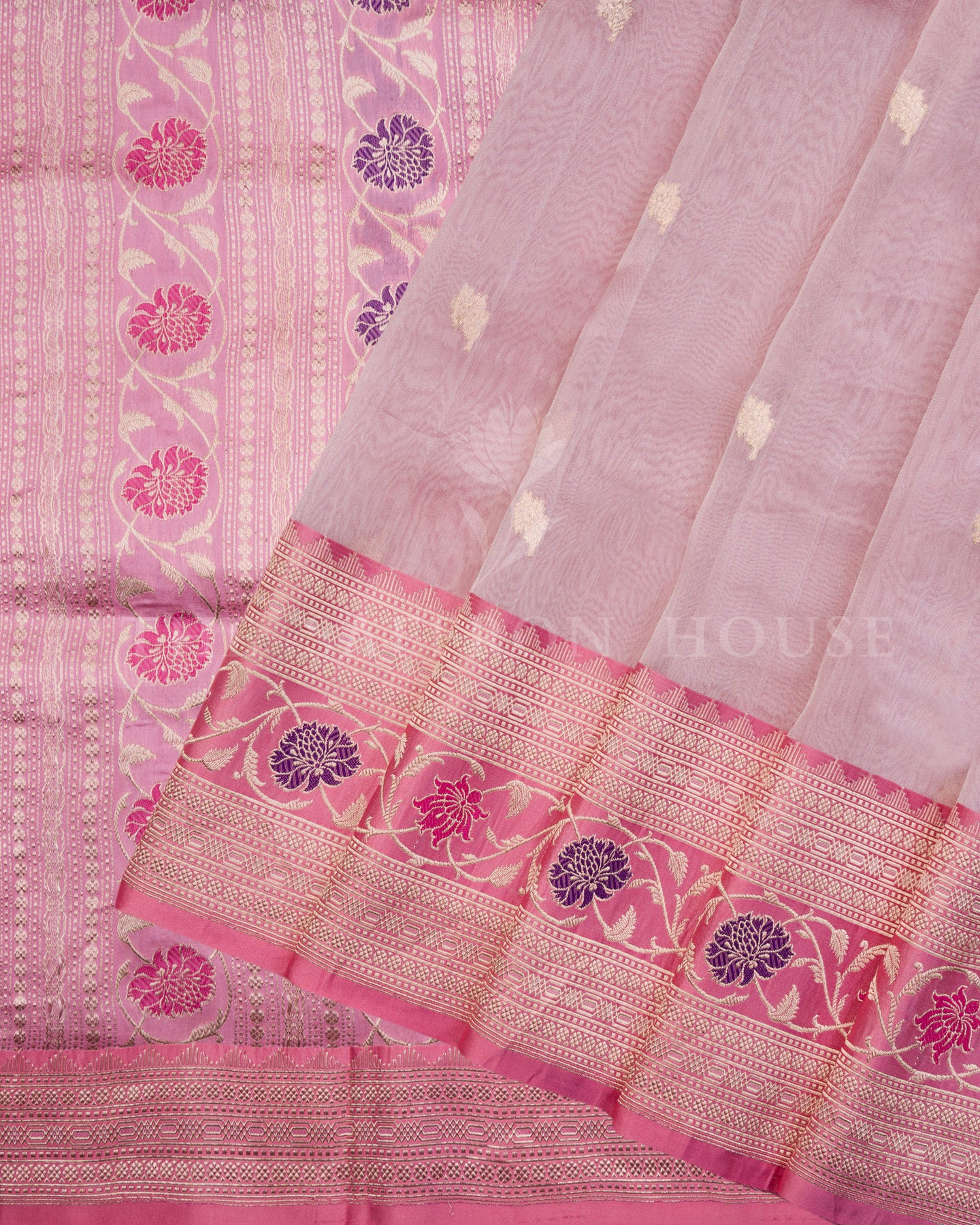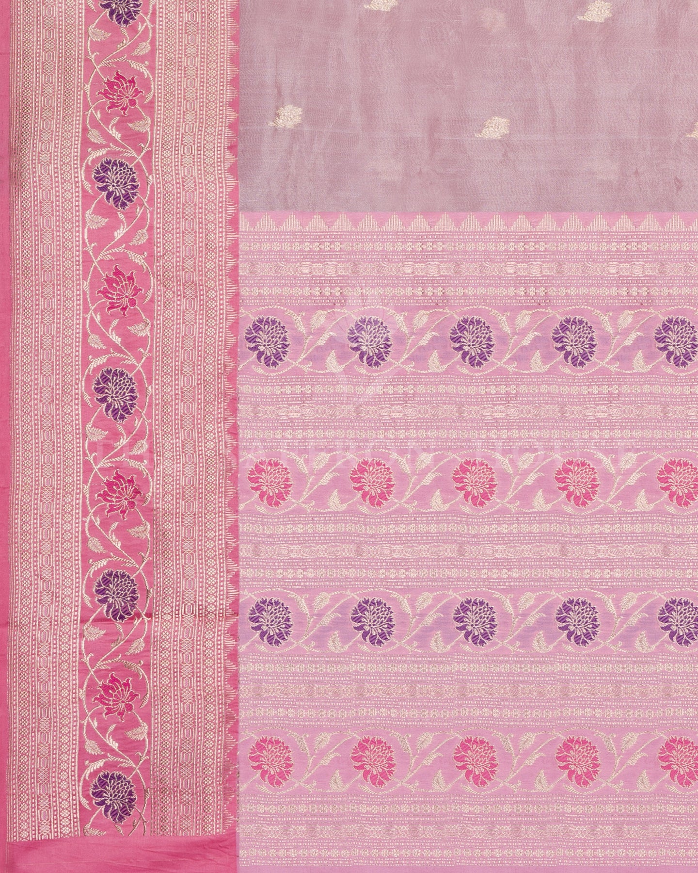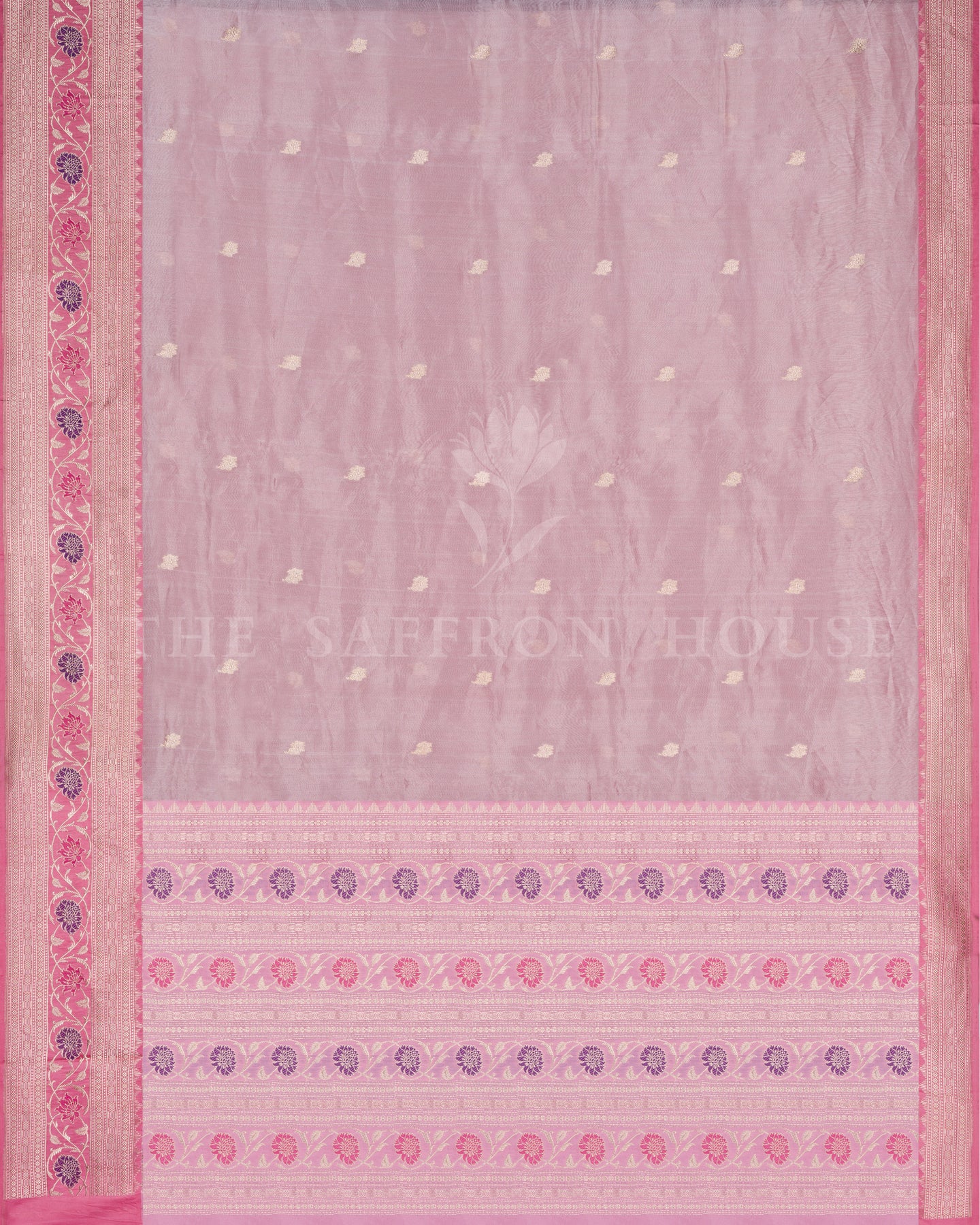 Rose Pink and Violet Handwoven Kora Banarasi Saree features vibrant chrysanthemum motifs in violet and magenta, meticulously crafted with resham and gold zari.